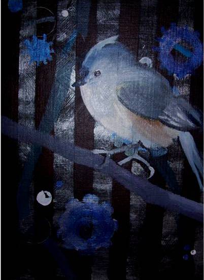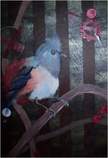 Today I finished the Ode to SteamPunk Tufted Titmice. The birds themselves turned out to be a little bigger on the canvas after all was said and done. They need ornate frames to complete their look. I am not sure how sucessfull they are, but I like them all the same. Steampunk doesn’t have the same effect in 2D. The animals don’t look like previous interpretations of the same birds. I like the metallic contrasting backgrounds. Inspiration: Laura, the veinte decaf coffee drinker was wearing a gorgeous titmouse cardigan. With help from Turkish Coffee. The addition of the gears was inspired by the Steampunk crafts I saw on BoingBoing.net. The Stripes in the background were originally inspired by a blue-striped towel and a painting I wanted for the bathroom to match. That painting is painted over, but the striped layering still affected the texture of the painting and helped me realize the fun of that pattern for this new series.