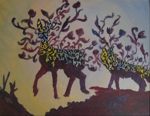 97. 2010. Deer/wolf. Acrylic and correction fluid on Canvas. 11×14.