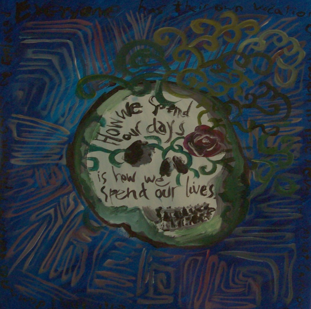 Matt painted this skull, too. The style was a little less sharp. Call it artistic flair, call it messy. I call it relaxed. Quote by Annie Dillard. I like the sentiment about how this is now, these are our moments. Why think that your life hasn’t really taken off? It’s been happening for some time.