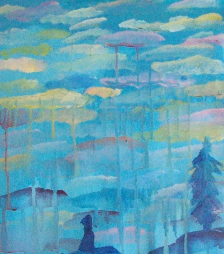 I’m a little morose. I was planning on painting some sort of landscape and here I paint this. I title it “Widow” because more recently, I’ve felt like I lost something, but I don’t know what, but I look at calm scenery, the bay outside my house, the distant snow covered mountains surrounded by an empty pale blue sky. It’s sunny outside, but cloudy in my wormy little brain.