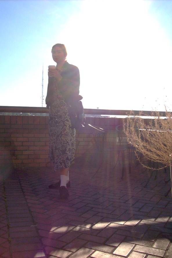 Self-portrait on the veranda. The sunniest day of this quarter, I imagine. I got my coffee from Peet’s down the street. Starting off the day with… apparently some composer named Mantz. It sounded more like Vivadi to me, but hey, there was 200 years worth of decent classical, it’s hard to keep all the files straight in the filing cabinet of my memory. (By the way, any of you who store information like that are bound to be bad at remembering because you’re not utilizing your strength of spatial memory to the fullest extent… anyways…)