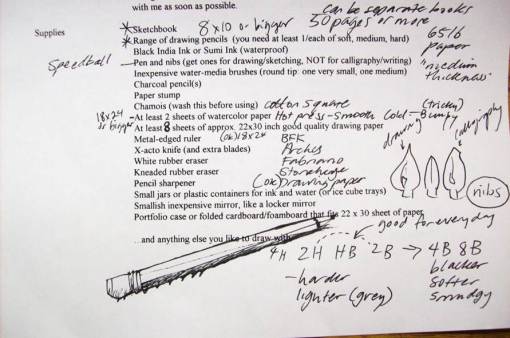 My first drawing class with Claire Cowie was inspirational and lofty-sounding. The syllabus presented things that I haven’t really explored. The kind of exploration that requires the headlamp and the nerves of steel. I am preparing myself for my clumsiness. I don’t think I am as good at drawing as the pictures I imagine I am going to create, but aim high. I purchased a sketchbook. My first one in years. The white pages, the fresh start, the encourangement of a teacher, all that is bound to give me the freedom to flourish. Claire emphasized how art and school are sometimes oppositional. Art is spontaneous and its origin is within. School is structured and compulsory and comes from without.