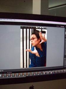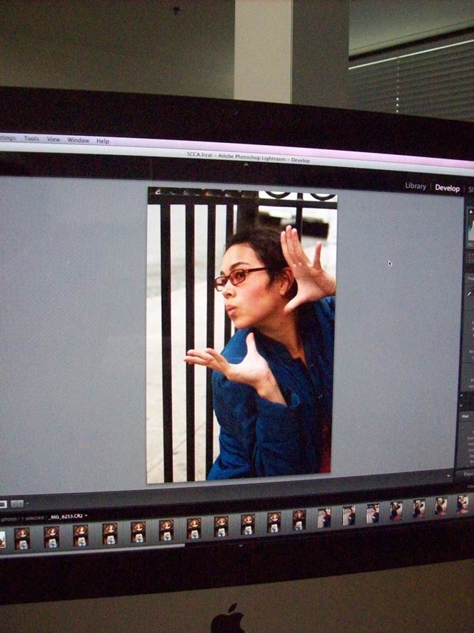 This is my first foray into using Lightroom, or rather watching the lovely Alicia go through photographs and flagging ones we liked and then narrowing down from that to the perfect (near perfect, or “that’ll do”) photo of the day’s shoot. Pictured above is the one she took of me that she is submitting for today’s portrait assignment.
