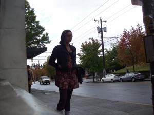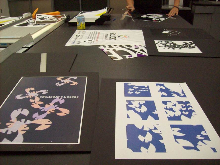 Reporting from earlier today: I had put mounting my designs on the black cardboard until it was about thirty minutes before class. If you have ever seen a design reality show, there are always designers (most of them) scrambling around at the last minute, scampering off to the sewing room or the spray-mount room for their final tasks. Everyone in the production lab was really generous with their supplies and distracted congeniality. I got it done, but with some lessons learned about spray adhesive and what it can’t do for you. All in all, though, I enjoyed having a convenient spray than gluesticking an 11×17 by hand.