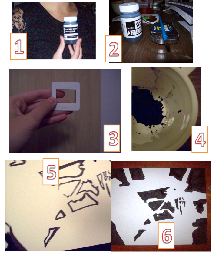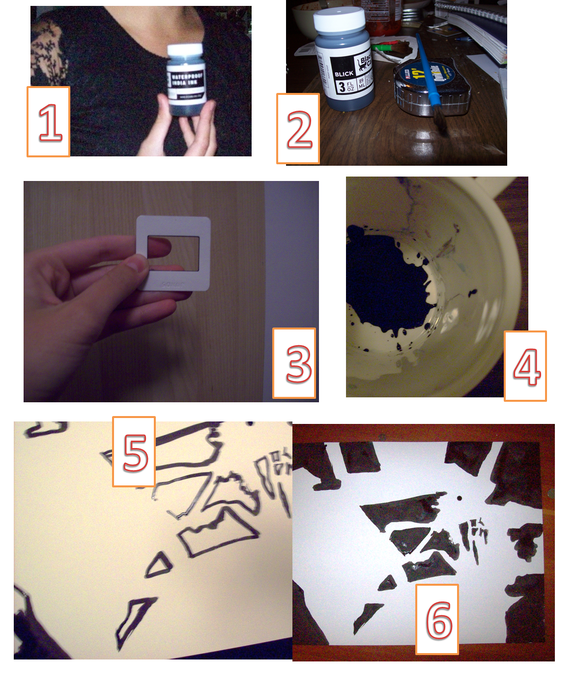 How to make Artistic Poop: Lessons from Failure. (1) buy the cheapest –and yet, due to their cute name (black cat), they make it into the shopping cart– ink. (2) Use the clumsiest crayola brush (3) Enjoy a tiny view finder which frames your picture-in-the-making so delicately, that the tiniest of sways from your non-drawing hand makes the whole composition wonky. (4) The ink in the cup is prettier than what it produces on the paper. (5) Draw. Go ahead and try. Draw what you see, draw what you thought you saw and then looked back and it was a figment pigment. (6) Color in the negative as per the assignment and admire teh poopzors.