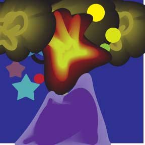 Here’s my Blob-Brush Dragon and his homeland, BlobBlending Volcano Island. (Done in Illustrator in class.)