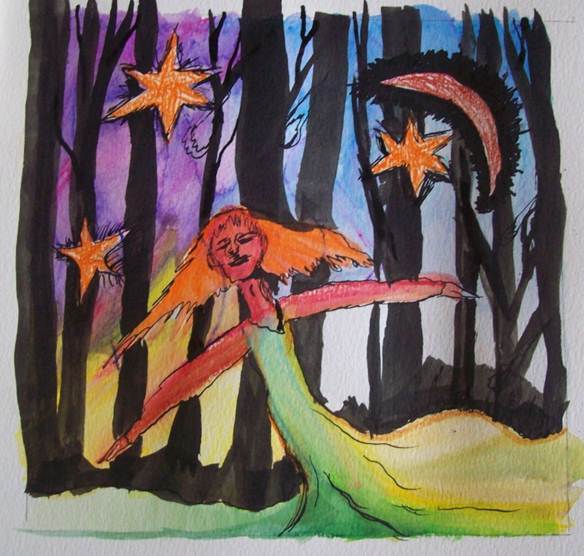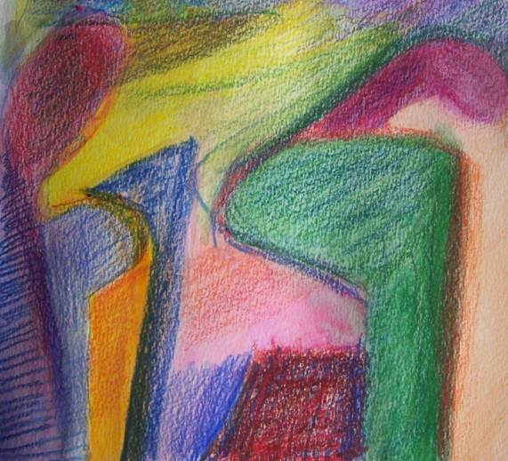 Today, color was involved. Pete and I went at some paper with watercolor crayons and woodless color pencils and ink. We played the game where each of us took turns drawing lines and coloring in shapes until we had something. Watching the pigment from the crayons melt with water was fascinating, that same enchantment when one finds brown milk after a bowl of cocoa puffs.