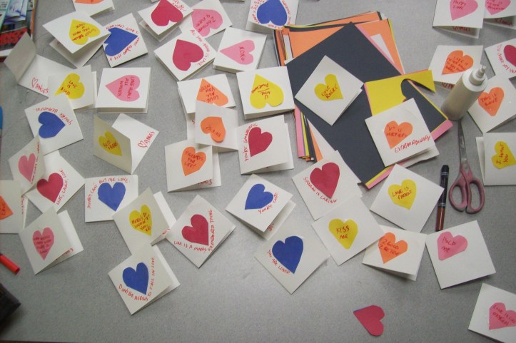 I made these Valentines at the request of my coworker who likes giving her delivery customers little greeting cards for the holidays. I’ve only done the Christmas ones until now. Valentines give a little more leeway for what can be said on one. It’s a holiday where you can be a little cheeky and you’re not offending someone’s sacred ritual. These cardstock/construction paper concoctions were created in something like 45 minutes and there are 50 (limited edition) of them. Each one says something different. Most of the sayings are lines from Moulin Rouge, but I imagined that Ewan McGregor could read aloud any one of these cards and it would sound right. This was easy and fun and I think we should bring back making these instead of outsourcing to Hallmark.