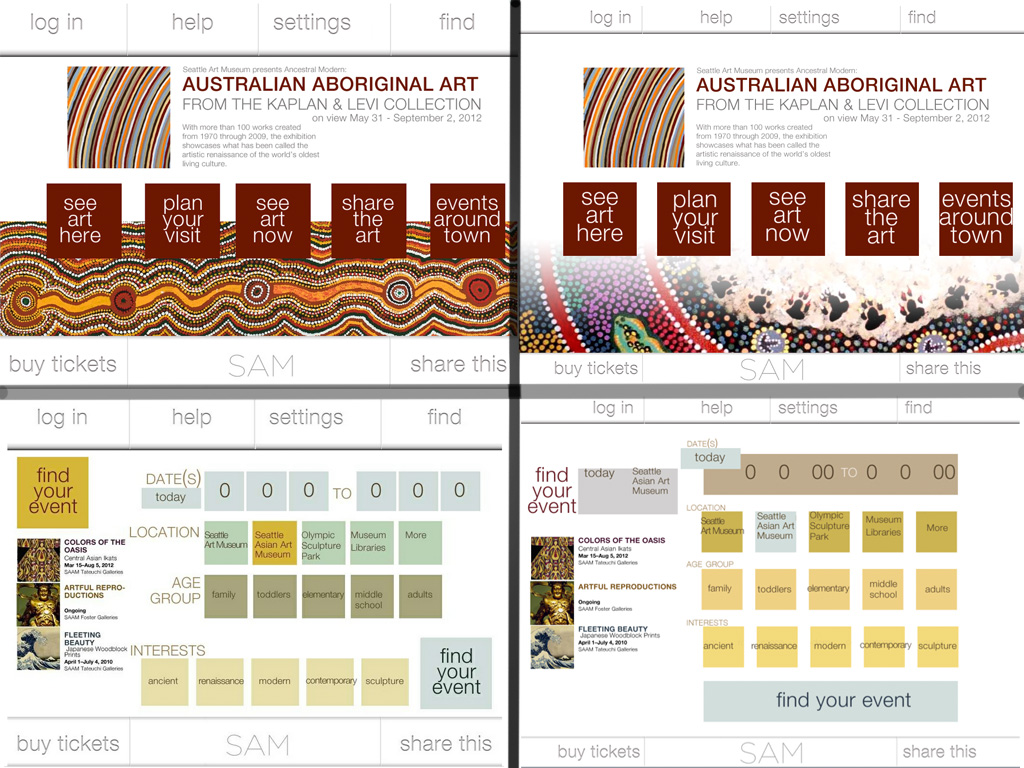 This is my last bit of school I had to do. I tidied up my Seattle Art Museum Skins. I scaled back some buttons and created hierarchy. I straighted out my layout a little and it’s looking pretty nice. Here’s the final presentation. I am impressed with how something can come a long way if you break it up into manageable pieces.