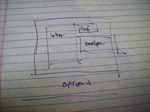 I should change the font on the name and make it san serif to contrast with the serif-ed logo. Think white space and clean. Next round, I’m putting all of materials onto a tabloid sized paper so they all fit. (See sup’s diagram.) I am pleased that everyone here likes communciating with paper and pen.