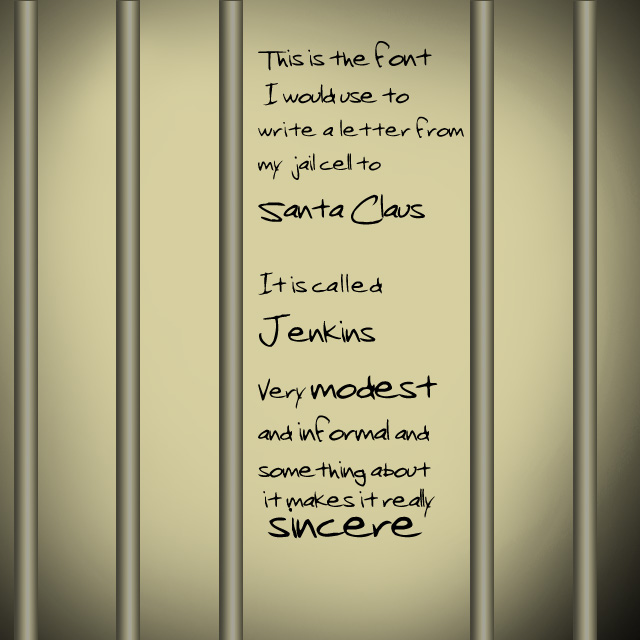 I am continuing my search for fonts that inspire me. Sometimes their names have a lot to do with why I pick them. Who was Jenkins? “Jenkins” feels a certain way to me. It conjures up the South, dill pickles and the title of mister, for some reason. Mr. Jenkins. He sits on the front porch eating his pickles, watching the cars go by. His whole life so informal that he never uses punctuation. He never had to. His parents, Mr. and Mrs. Jenkins either. In fact, at family reunions, he walks around not really talking to anybody, but that’s okay because all the Jenkinses are like that. All Jenkins’ family reunions involve thirty people dressed in plaid away from their stoops, not knowing how to handle themselves. Jenkins’ reunions would go a lot better if they had a giant front porch strewn with rocking chairs centered on a round-about.