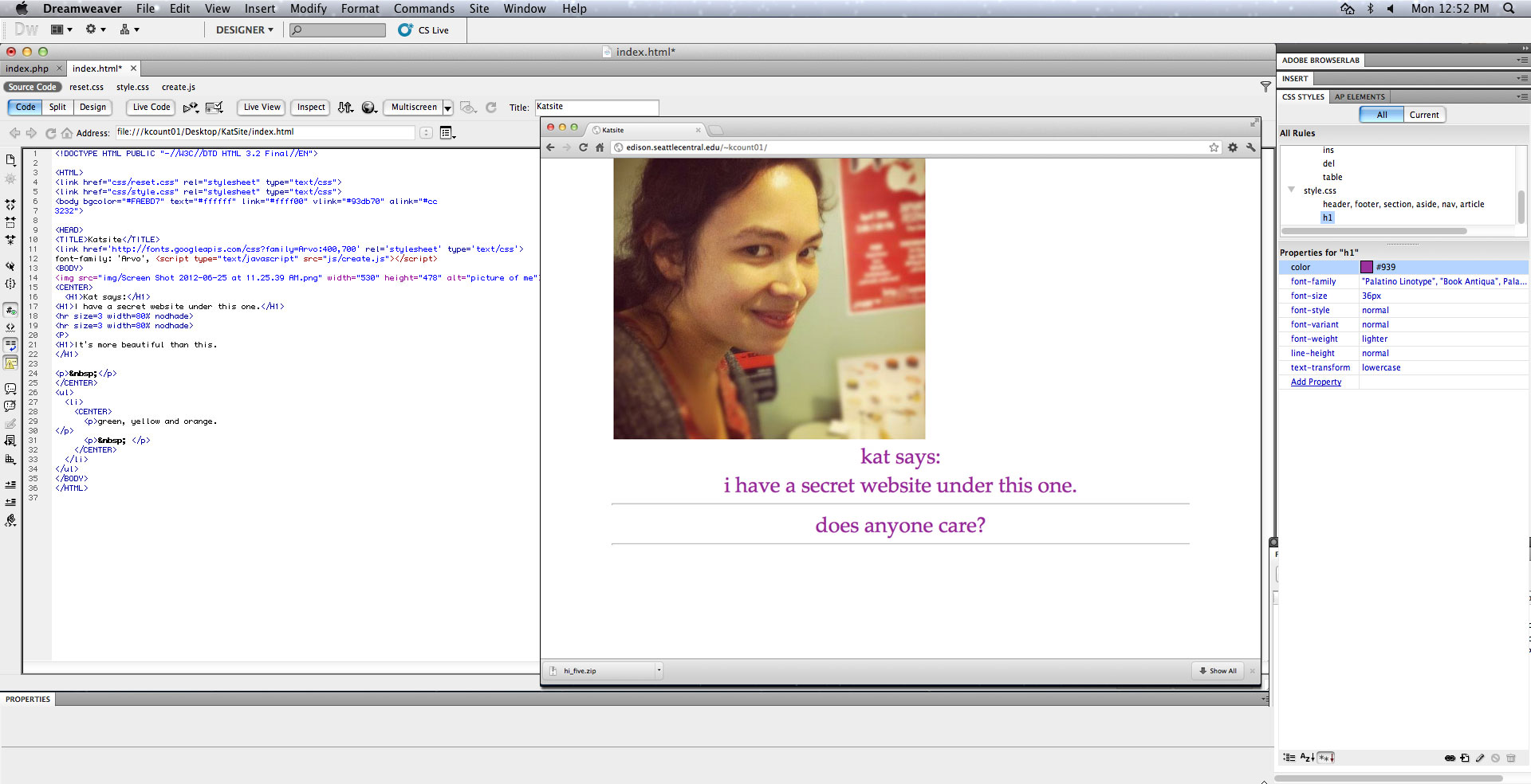 (Above: a screen shot of my new and already gone primitive website. Kat says: I have a secret website under this one. does anyone care? Our teacher talked about how each website has html that no one sees that describes the page to blind people. He asked why do we care about blind people? It’s because Google is the Blind Man that will bring us our audience and employers. )