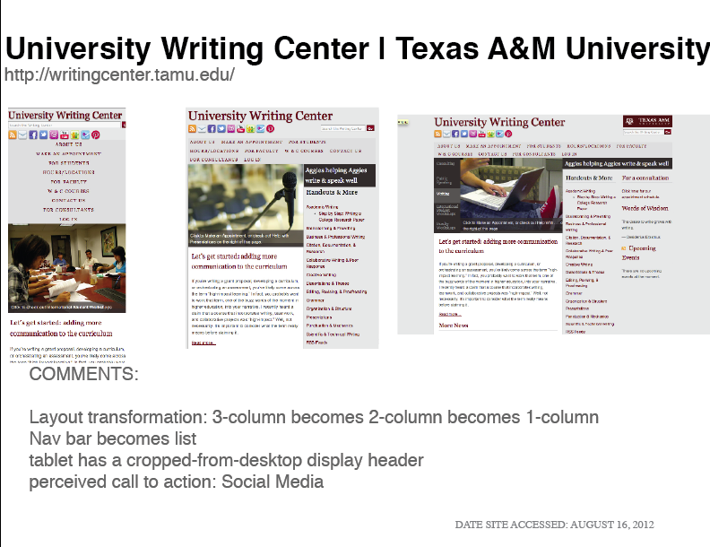 For my research, I decided to collect screenshots of school/university sites. Karine Joly writes about how difficult it is to update a school website because of funding and staff limitations and the best solution is Responsive Web Design because it anticipates the future and all of the various mobile devices we are destined to be using.
