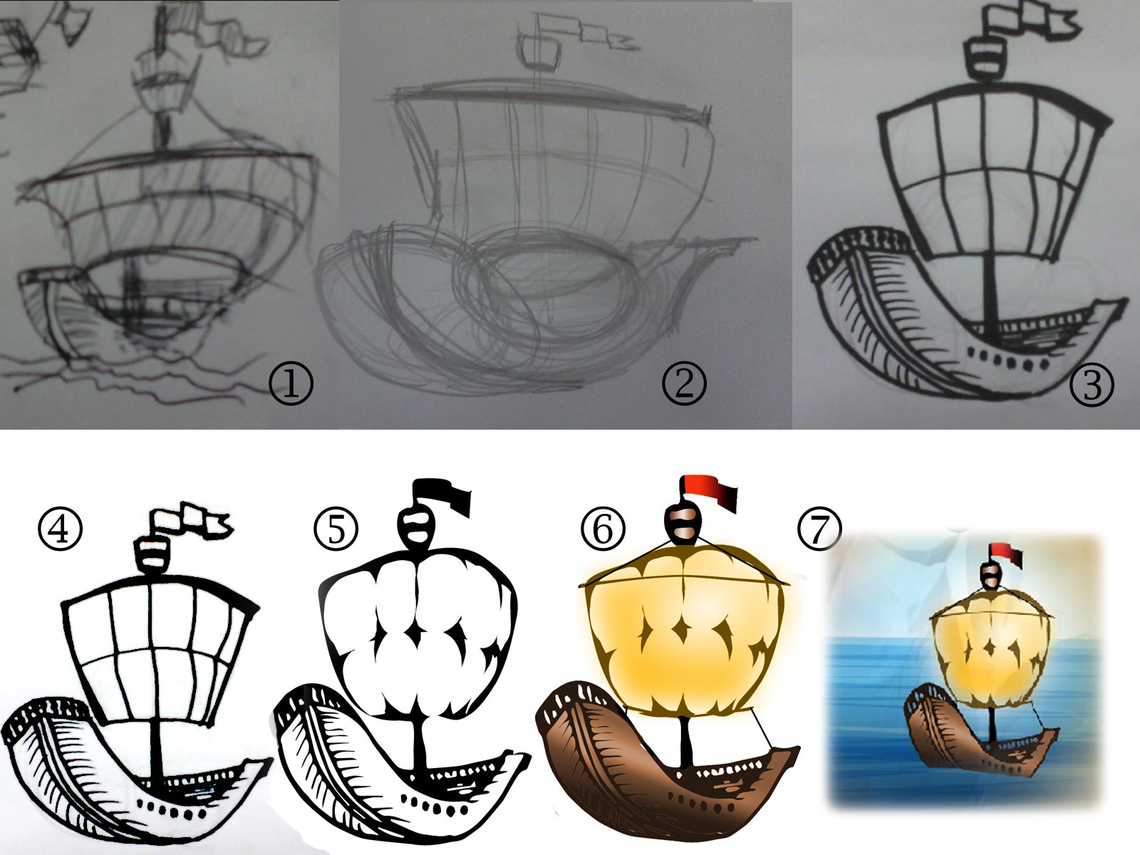 1) I sketched a boat in an angle I thought was dynamic. I used a ball point pen.