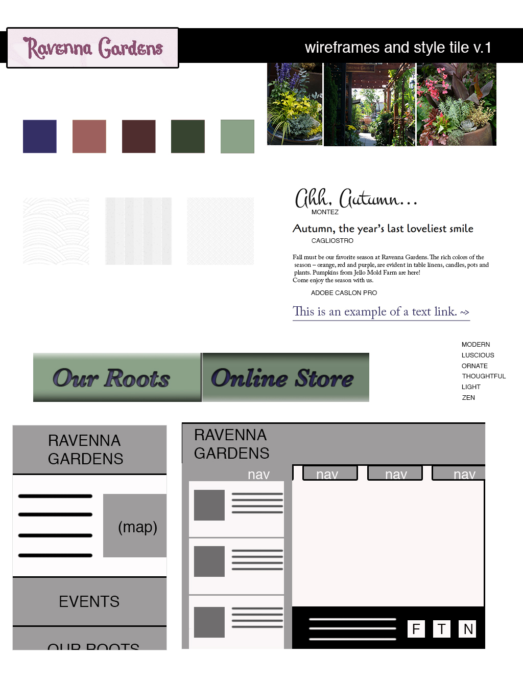 I sketched three versions, starting with the mobile version first and I ended up with one that I thought was most functional. On the mobile version, the map, hours and location prominent and on the desktop version, social media is featured. Also, here’s a style tile. (I updated my html from last week to have more content. 3 links to articles on the client’s blog — currently nonexistant– and I am planning on adding social media buttons.)