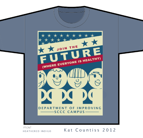I wanted to create a design that didn’t speak negatively. “Don’t do this” doesn’t really resonate with people. My campaign slogan “Join the Future” is positive and subtle. The underlying approach is peer pressure. Join the future, join the people of tomorrow, the forward thinkers. I wanted this to be a versatile shirt. It can be used for a bunch of different events. I also did not target smokers whom with I greatly sympathize. As for my color palate choices, I think I may have been influenced by the ubiquitous political talk of the upcoming election.