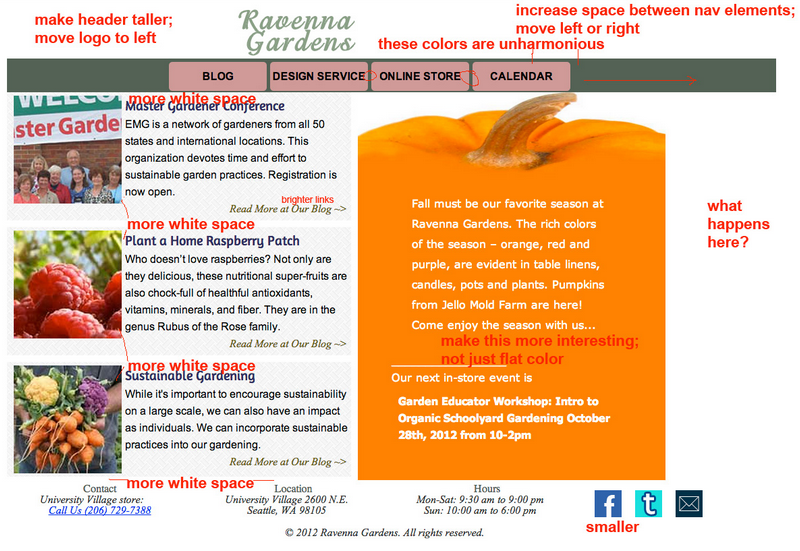 Why does it look so different from last week? Well, I had one of those moments where I realized I wasn’t fully grasping the brand’s identity. The logo seemed separate from the page and the navigation seemed to be slapped on there. Firstly, I redesigned the logo. Then, I consolidated the nav, social media buttons and logo into the header. And slipped the contant info into a third column on the side. Pretty much the principle of “important info flows to the top.” I reevaluated the content and separated the second column into more meaningful chunks.