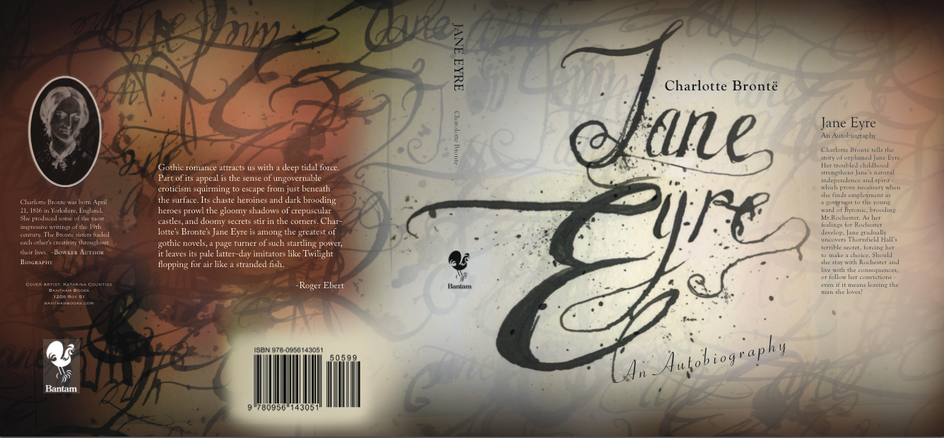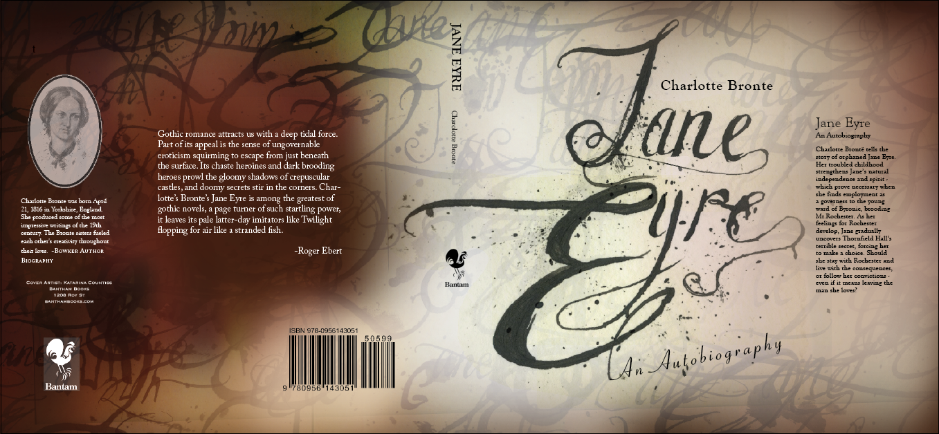 Update 11-3-12: I realized that grasuc (my conscientious commenter, see below) had a point. Something was lost from one to the other. Boxes are a little modern, but they help make the cover look a little more intentioned. And I think I was a bit extreme in my coloring, so I scaled it back and structured the soft splotches a little and I am feeling good about my design. (The final has the former image of Charlotte Bronte, I don’tknow why it inversed itself in the pdf forming, but I thought it looked kind of cool to keep it like that here.)