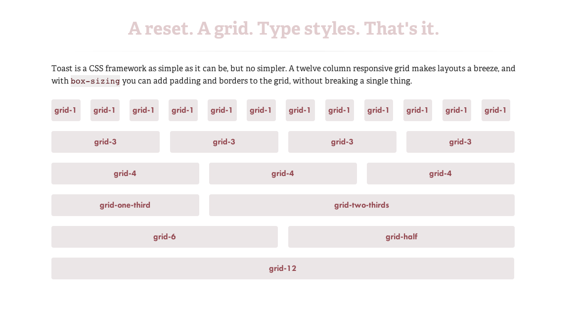 Toast | A simple CSS framework. Very simple to 1140px (The 1140px CSS Grid System · Fluid down to mobile) that I have been working with. Two break points. Simple package: style.css, rest.css, grid.css, toast.css
