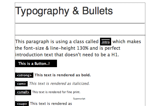 - base.css: All the generic styling you would expect I .e. h1, h2, h3, h4, h5, h6, blockquote’s, Links, Bulleted list’s etc. and your standard generic CSS reset.