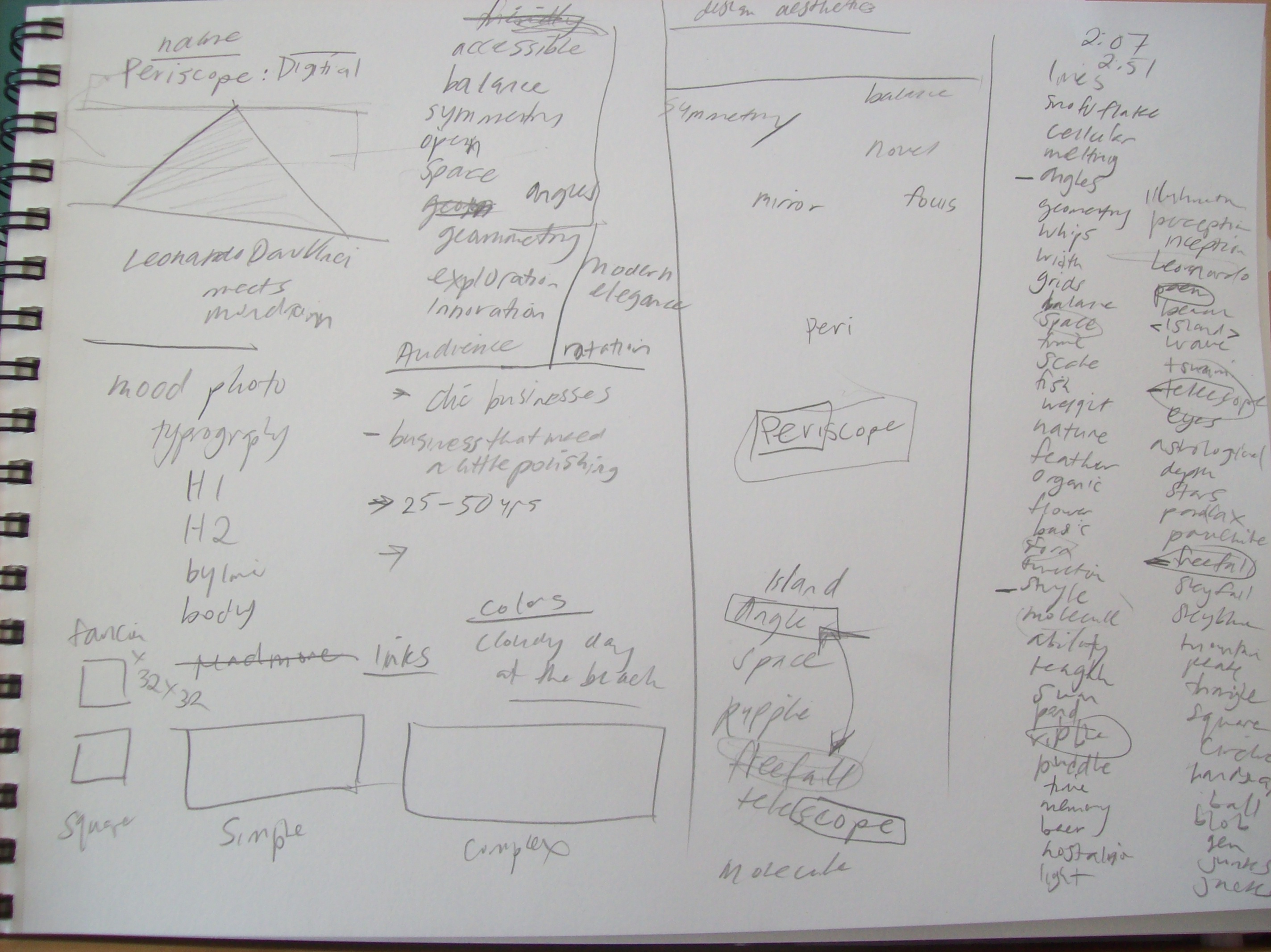 Today, the team met for an hour to talk about the brand, its name, colors, aesthetic. We started with tone and then a word association brainstorm on “symmetry” which lead to the liking of the words: telescope, angles, free-fall and space. That lead to the new name of our Interactive Strategy Company: Periscope Digital. The brand is geometric and innovative, drawing inspiration from Leonardo DaVinci, Piet Mondrian and the calm ocean.