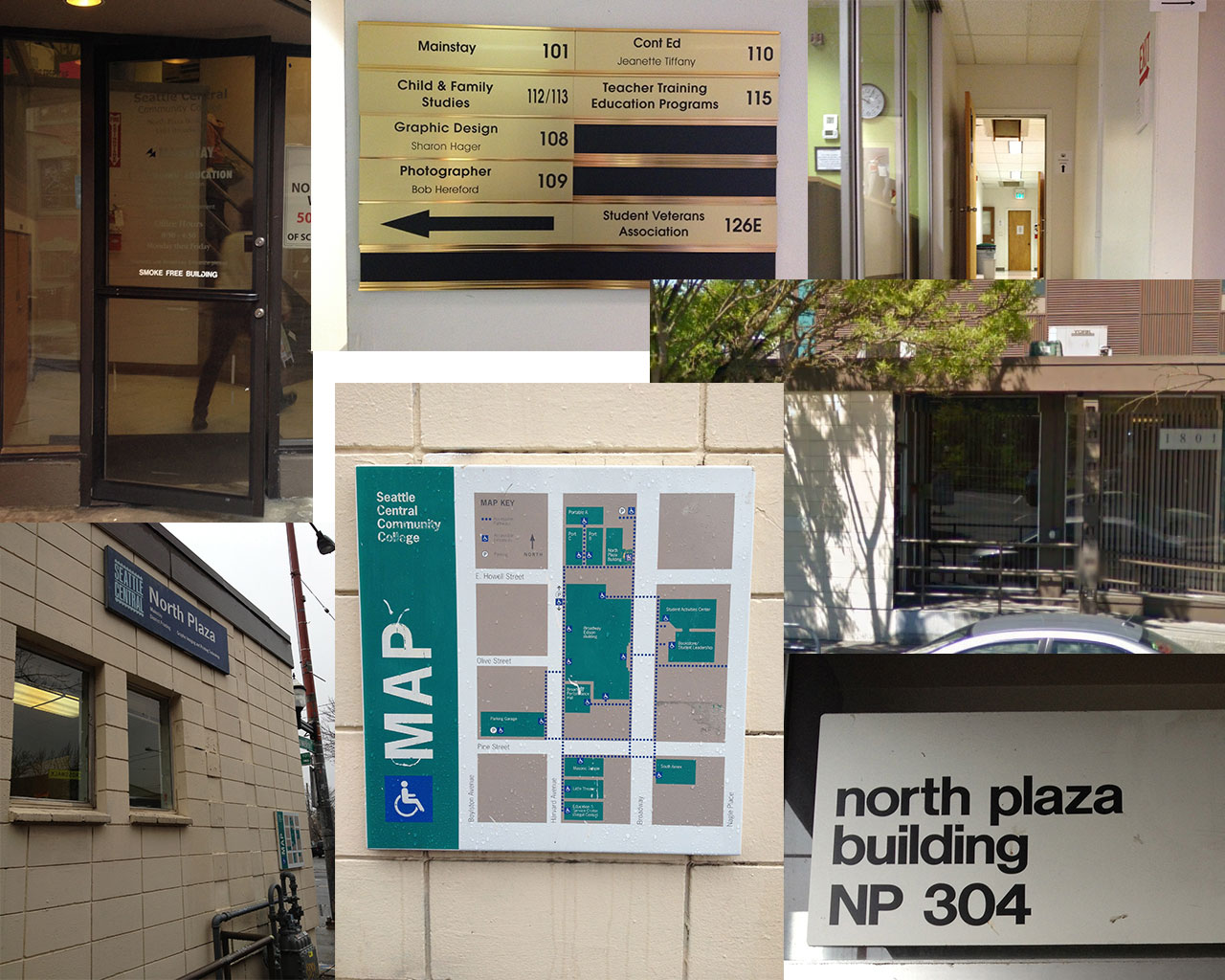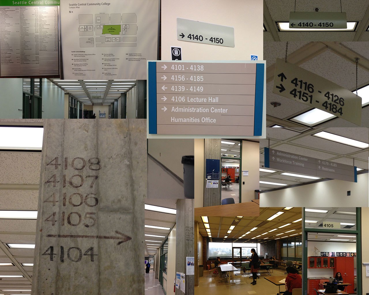 Today in groups of two or three, students from the Environmental Graphic Design class scoured Seattle Central Community College and took notes on how easy (ridiculous) it was to find random classrooms. My team (Joyce and I) were assigned to find “SAM 404, NP 304 and BE 4105” from the North Back entrance (entrance most north and on the west side of the campus). The way this is phrased is really crucial because that is how room numbers are listed in registration, the room numbers’ abbreviated building designations, but the building signage is sometimes abbreviated, sometimes not.