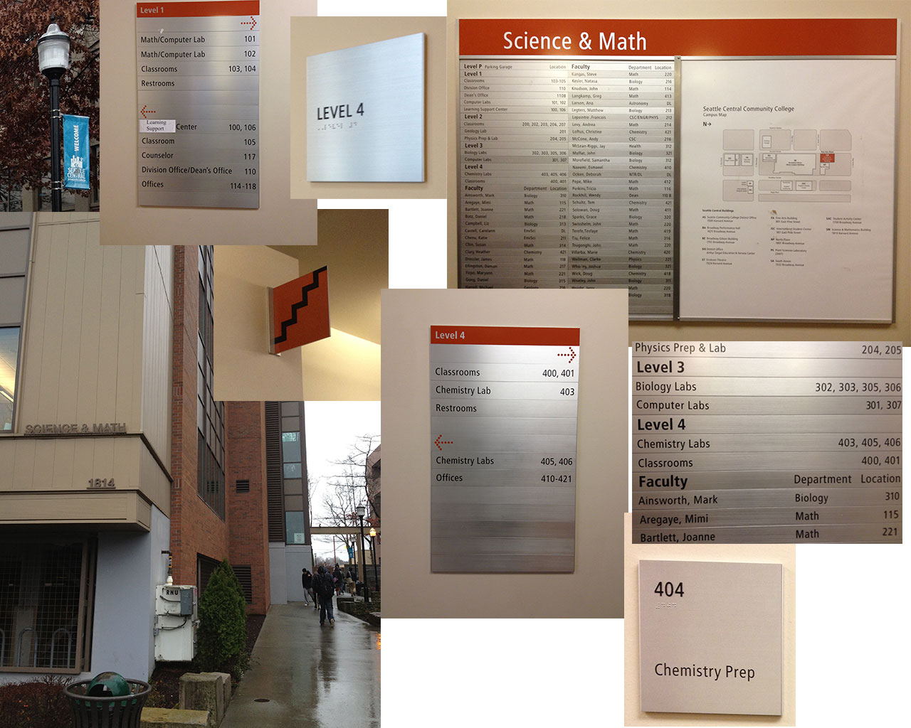 Things that worked: Sign on side of the building facing, all caps bold permanent fixture. Banners that said “Welcome to Seattle Central” in blue. After entering building, the map and directory is on the right, official placard, clear map. We took the stairs (stairs had a sign in front of it, pretty clearly indicated stairs with a simple zig zag). Nice orange theme.