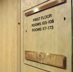 Things that didn’t work: White lettering on glass on a door didn’t stand out too well. It turns out that the first floor isn’t connected to the third floor. There was signage indicating the various rooms on the first floor (gold placard), but no indications to stairs or no. Sign that says NP 305 in bold black san serif lettering only visible from handicap ramp which is the only way to get in.