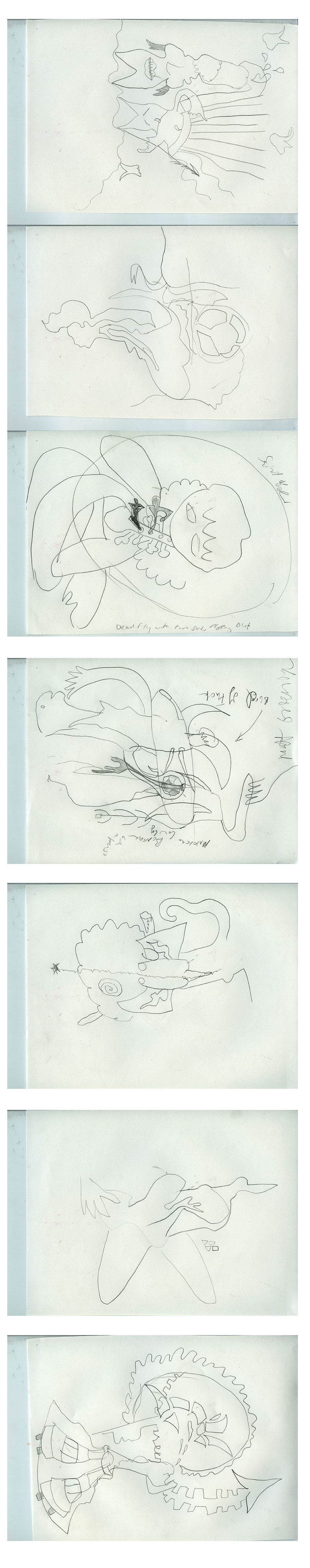 A friend and I made these drawings. We worked on them together one line at a time seeing different things in them. I really like the simple line quality on them.