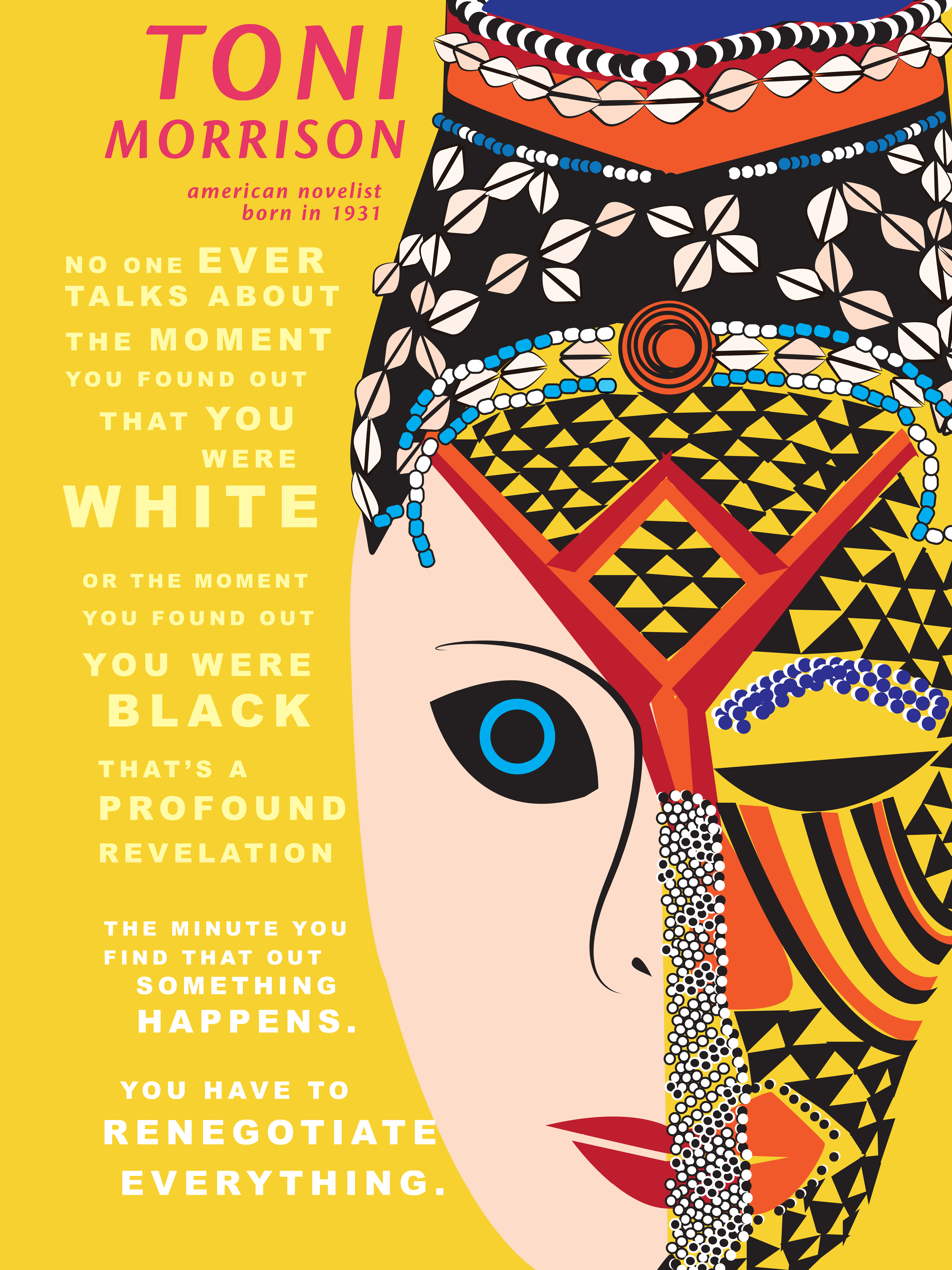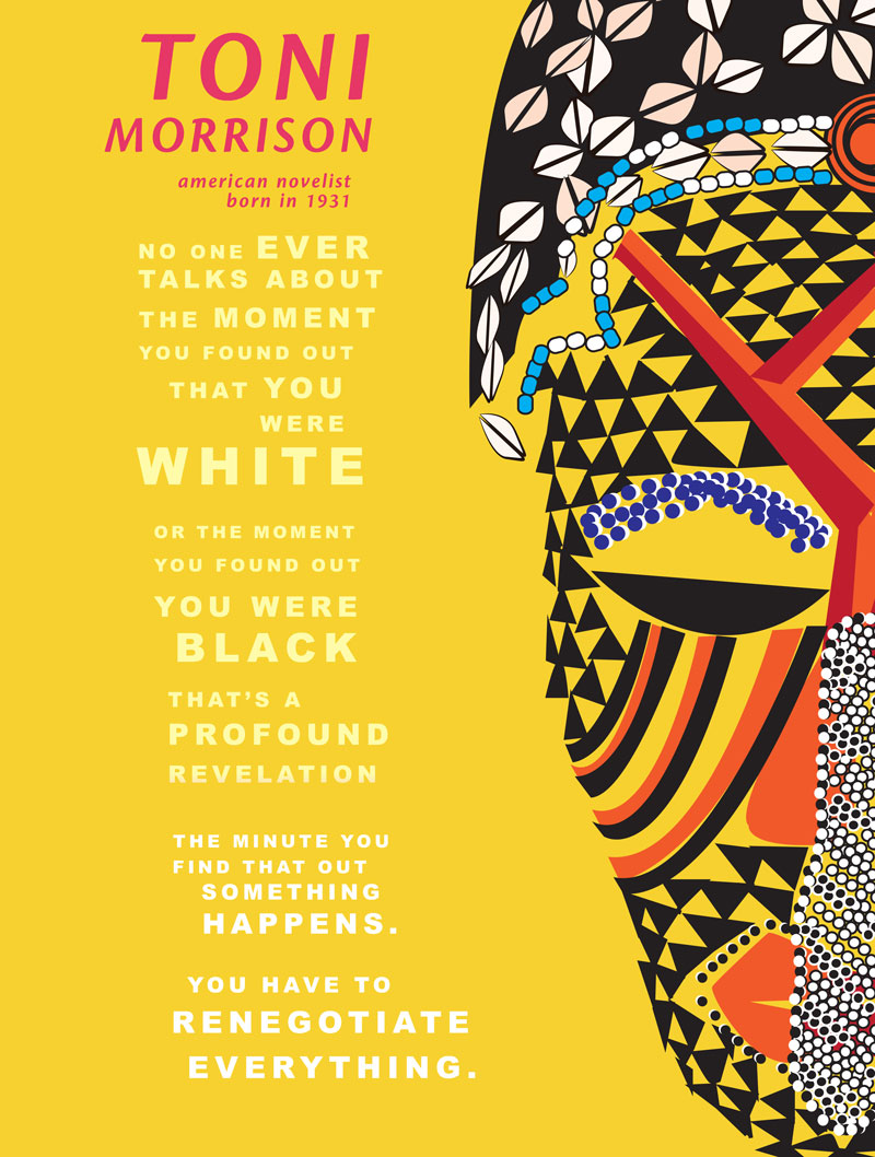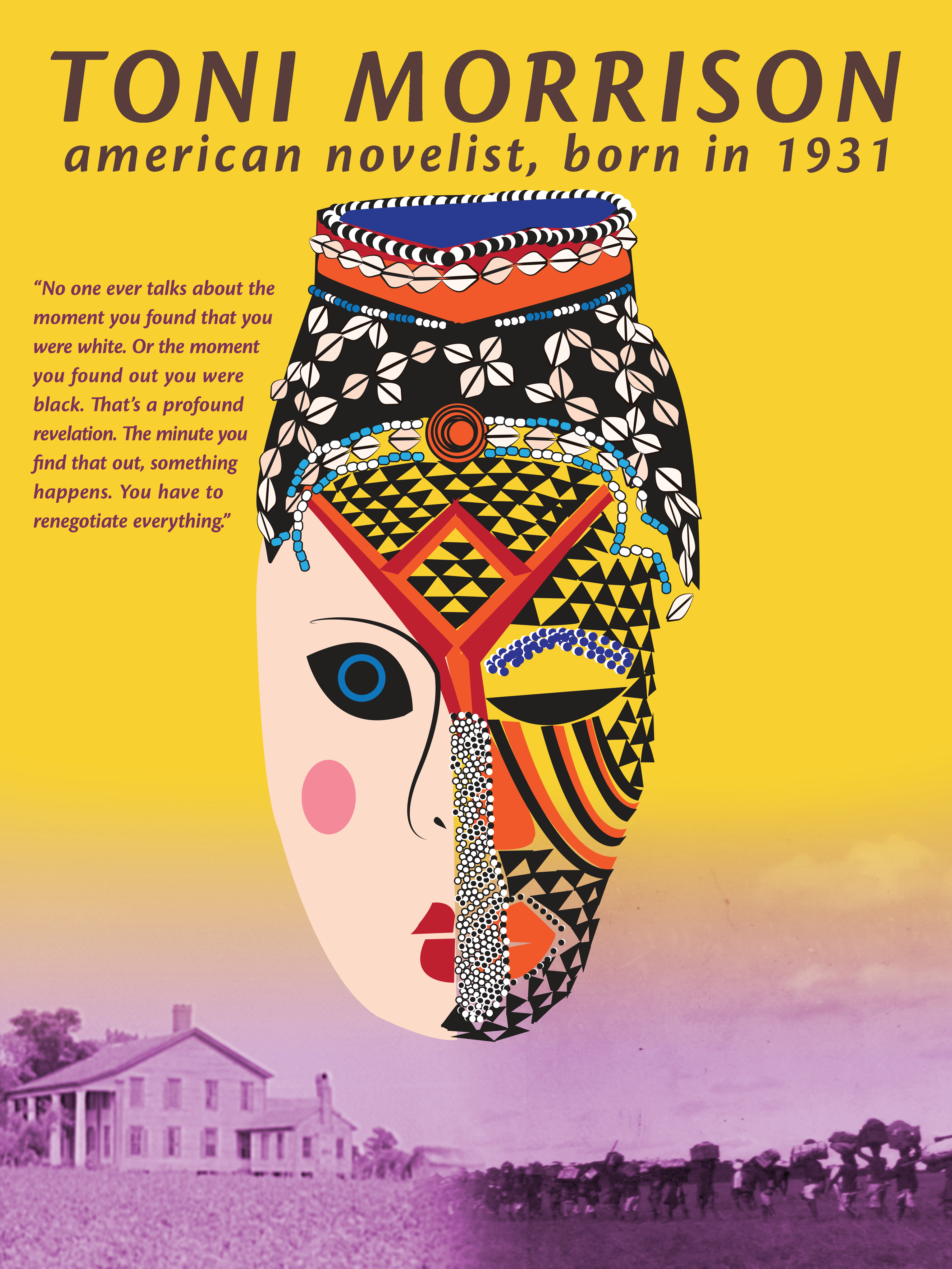 In honor of black history month, the assignment for this week’s poster is an educational poster about a figure in black history. My subject: Toni Morrison, a Nobel Prize Laureate for literature. I was inspired by this quote I found from one of her interviews talking about race and identity. One of her books, The Bluest Eye portrays a little black girl who wants to be white. The photos in the poster are from the Library of Congress, on the left a photograph of a plantation in Georgia built by slave labor. On the right, a photograph as the summary says at the Library of Congress website, “Photograph showing African people carrying supplies and equipment atop their heads for Theodore Roosevelt during his African safari.”