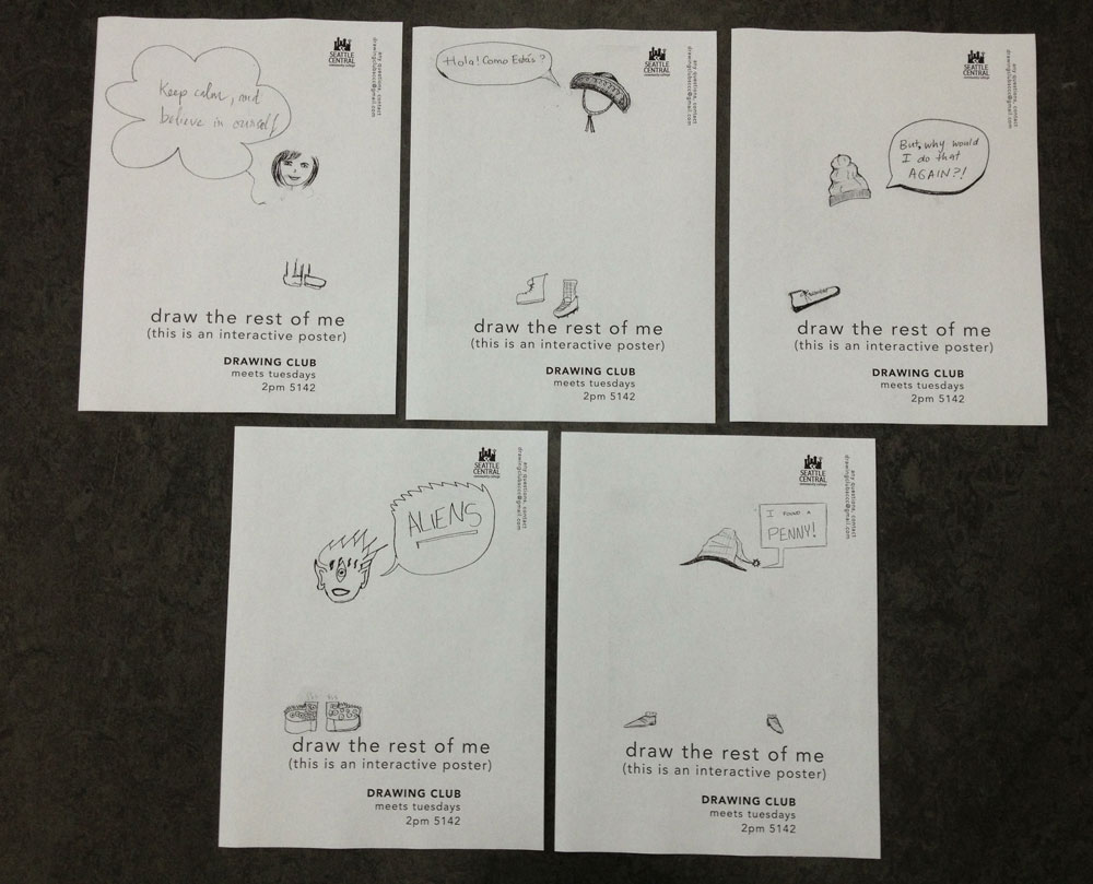 Today in Drawing Club, we did some imagination exercises, made drawings based on fun facts and some blind contour drawings. We also made more posters for advertising around school. (They are interactive!)