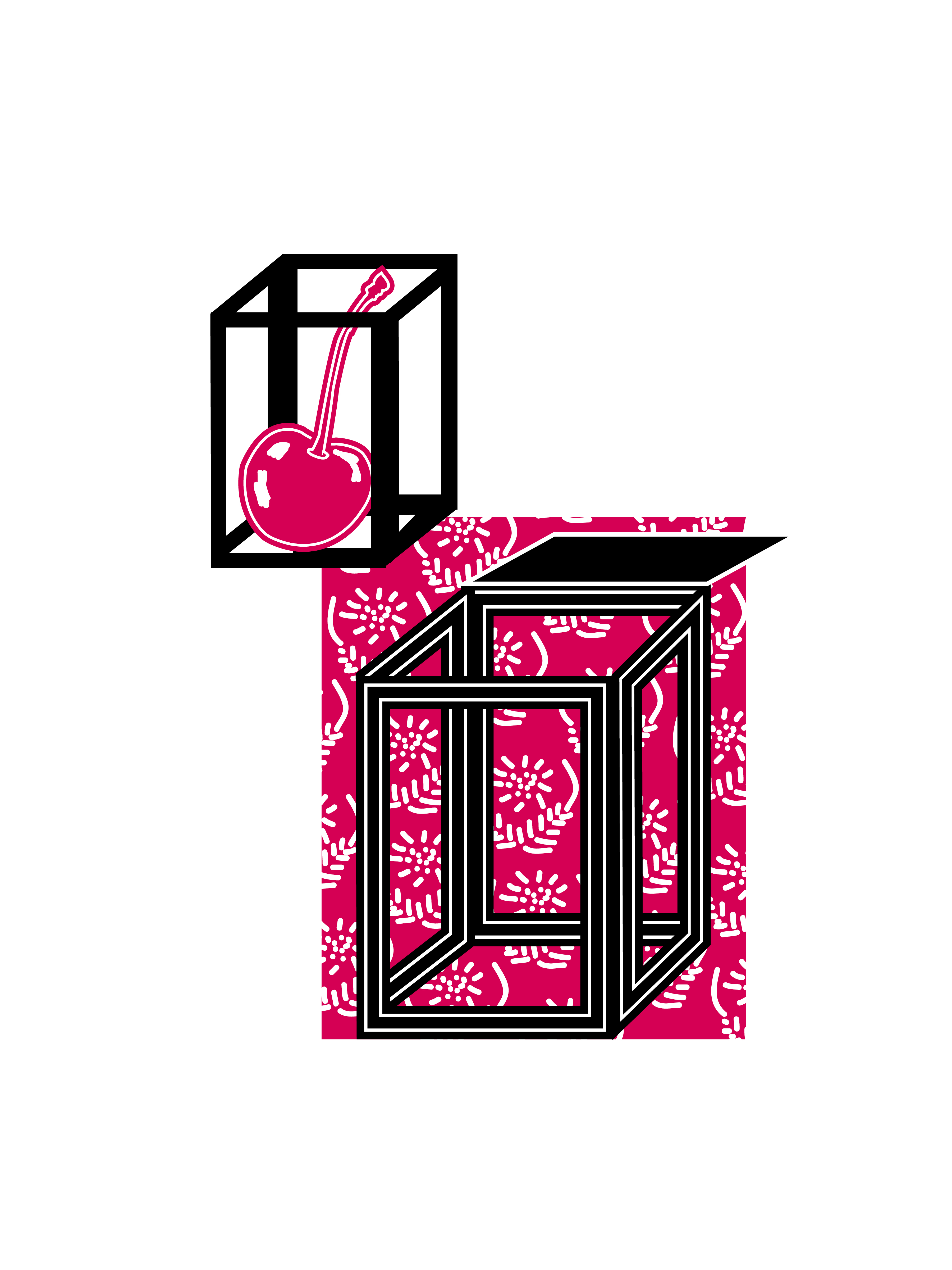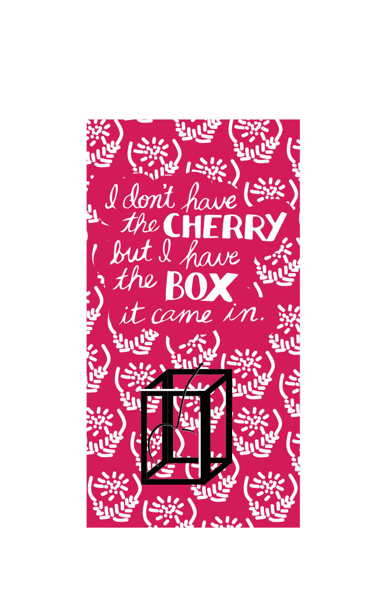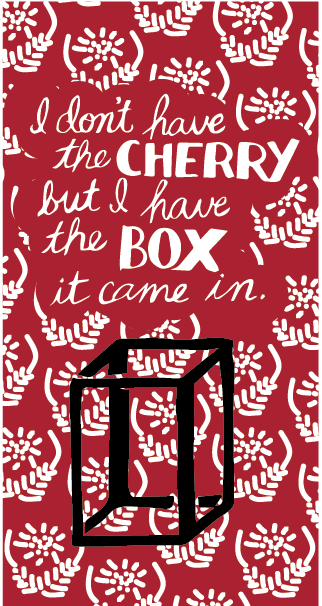 After watching Jill demonstrate the Letterpress stuff, I’ve decided to go a Letterpress route instead. In a group, we looked over this design and said that the image of the cherry conflicts with the quote “I don’t have my cherry but I have the box it came in” that I want to include in the poster. Val had the idea of creating an debosse of a cherry silhouette to be placed inside the box which will only be noticeable under raking light. Jill said that putting the type in white and extending the pattern would integrate the type with the image.