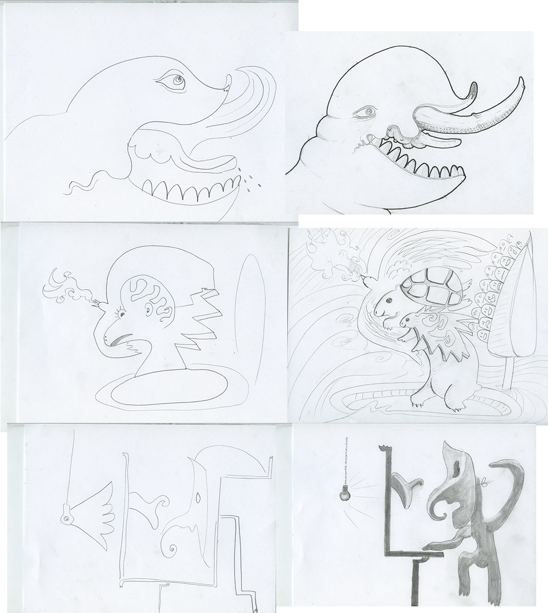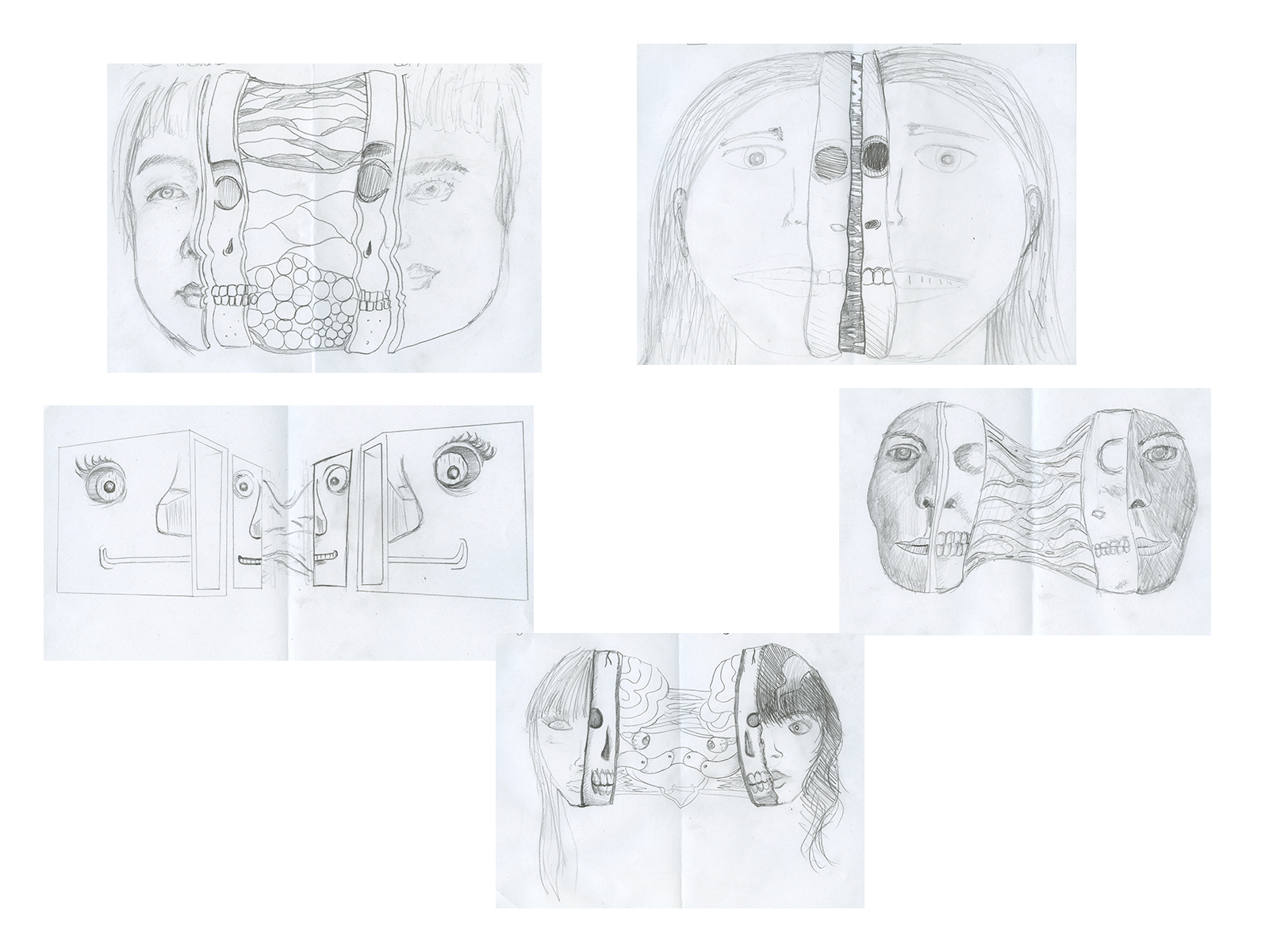 Inspired by something I saw on the internet, we did this drawing exercise. We each drew half of a face and then passed the paper and then someone drew the other half. Drew a skull sliver and then pass the paper (and copy) and then drawing connecting bits… eww. It was awesome.We did some imagination exercises and some blind contour drawings. And we did some rudimentary animation using tracing tracing paper. (I will put those into a little animation and post them later this week.)