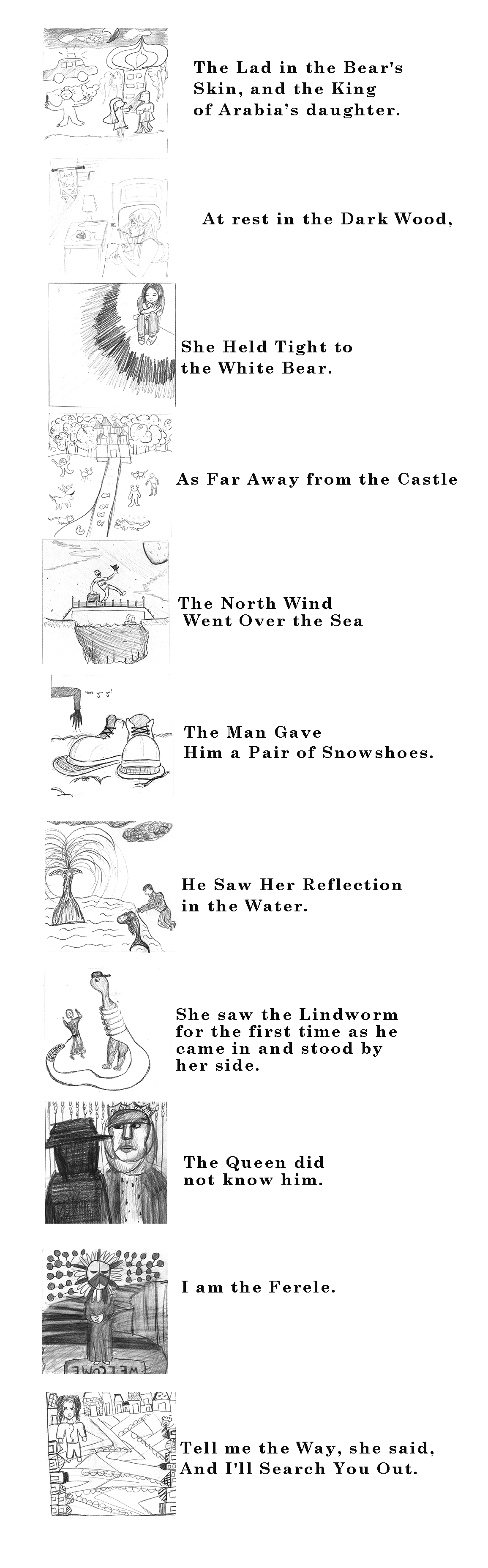 Today, inspired by this post about illustrations from 1914, each person was randomly assigned two lines from the captions of these illustrations/lines from a Scandinavian Fairy Tale and drew an illustration for that line. I put them together this bizarre story. We also did some blind contour drawing and imaginative collaboration drawing exercise– I should look up the name for that –game.