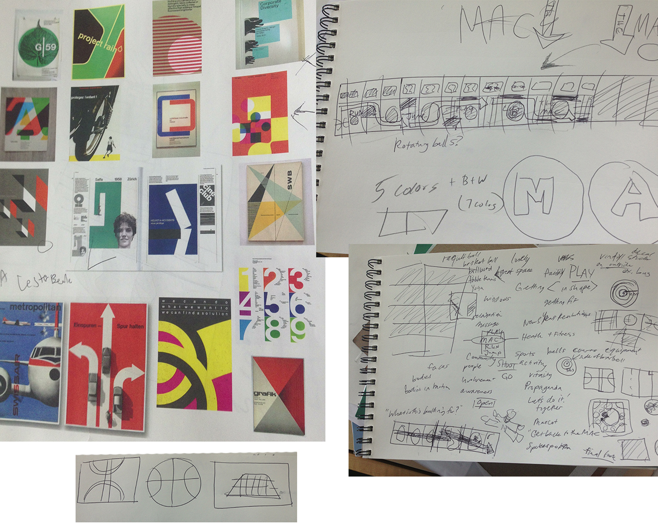 The aesthetic: We wanted to be inspired by the graphic and energy Swiss Ski Posters and tie it together with the sports/activities of the MAC. We drew out some thumbnails and general concept. After meeting together and trying to find a color palate we agreed on (just swatches) we found that we could not. So, we’re going to design first and separately, then consolidate the palette afterwards and integrate our designs. A limitation to keep things simple for when we come back together is to use only 5 colors and black and white. We’re going to start with the 13 windows that are lining Broadway avenue, then use those successful ideas to inform the main entrance’s windows.