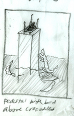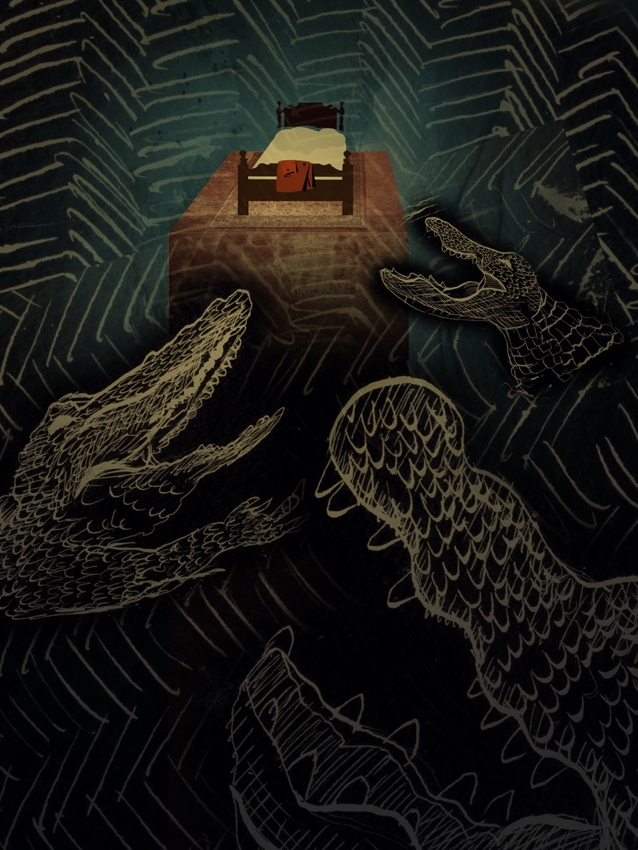 I wanted to create a haunted image relating . I made the bed in illustrator and drew the alligators with pen and ink and then assembled it all in Photoshop.