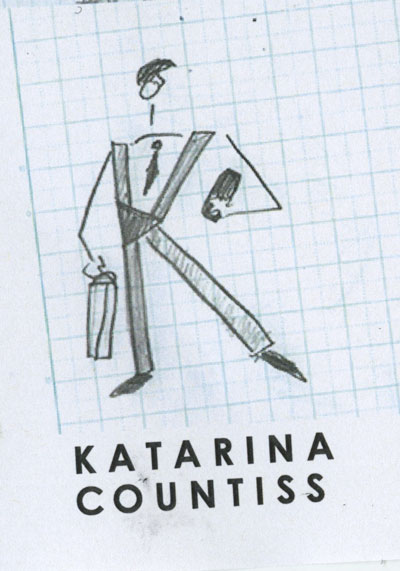 I had great feedback in critique today. Tom said that he “got” the idea of what I was going for with the type, a kind of 1920’s book title page look (centered, stacked, hierarchical type and playing with tracking). He said that perhaps a traditional typeface can bring that look out a little more. He liked the hat and lollipop head. He thought it was very “NewYorker” but the character needs work. I try to get Tom to like characters I make (he dug the pirate) but this one lacked charm from the shoulders down. He said if possible, try to just integrate the “swizzle stick.” I don’t think a lollipop sticking out of the wordmark would do, but I decided to take his advice and simplify. Here’s my new idea. I love it because it’s a nod to Magritte (The Treachery of Images – Wikipedia, the free encyclopedia.) and a mnemonic (Hat=Kat). I am beginning to embrace the idea that my name is made up of existing words (Kat Countiss= Cat Countess).