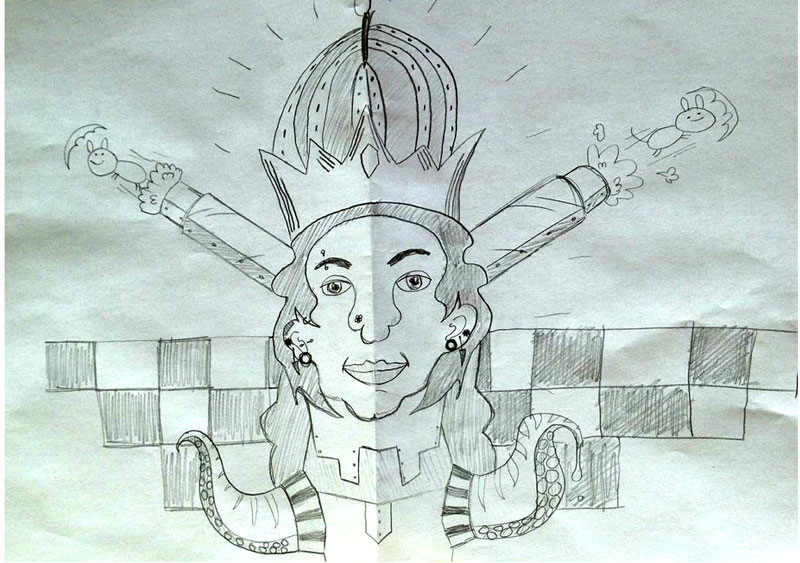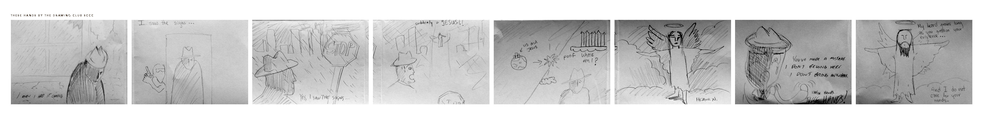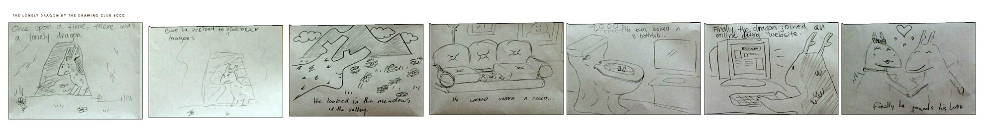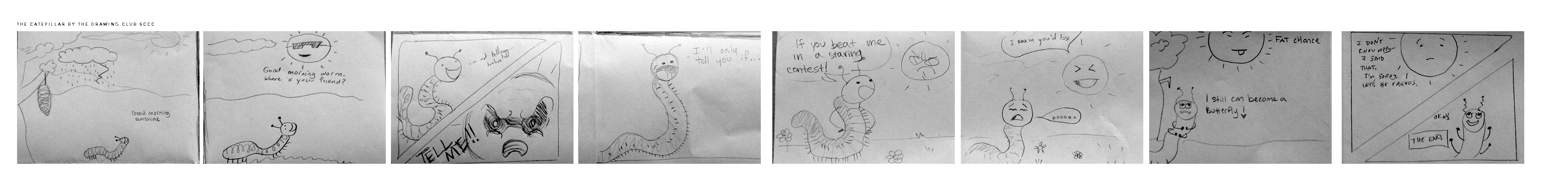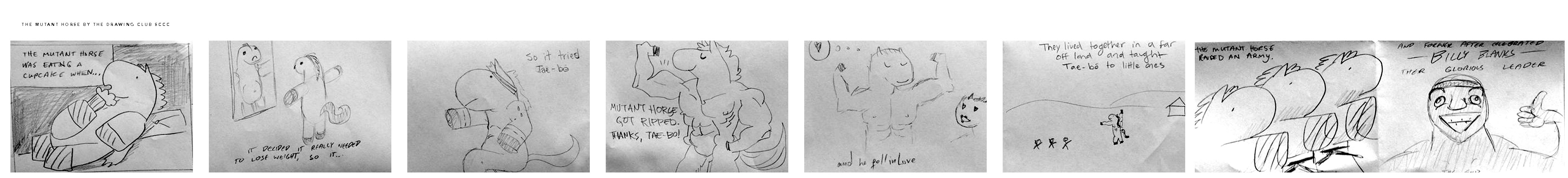 In Drawing Club Last week, we did some blind contour drawing and some drawing improv games where you pass the paper around adding to the drawing, one of them making sure that whatever randomness you added was symmetrical, another game where we made panels for a comic, each person taking a different panel, forwarding the story.