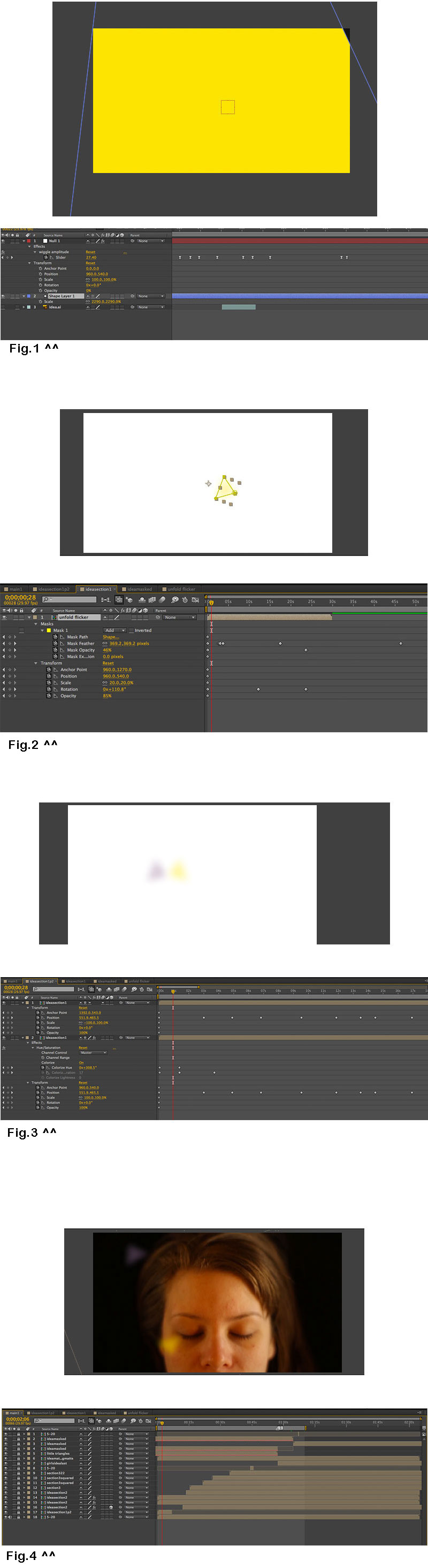 Fig 1: From my animation partner, Pete: “Here an attempt at the flicker animation. I used the wiggle expression on the opacity and position parameters. To turn on and off the opacity wiggle, I made a null object, added an effects slider, linked it to the wiggle amplitude and then animated using the slider. It’s pretty easy and I’m happy to show you how to do it. There’s also a video tutorial if that’s preferable. The file is attached so you can check out the parameters. http://www.youtube.com/watch?v=_pFM7TDYYZk” I use this flicker effect as the base file for all the triangles I use in the first part of the video, giving them a feeling of new and uncertainness. I put this file into “Ideasection1” comp.