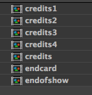 This is a screenshot of my file structure in AfterEffects. I put all of the credits into one mp4 for safe keeping. I named the title sequence the credits, but other than that it’s good. The numbered credits are for the different parts (part one, etc) and the end card goes on to each of them. Credits and end of show is for the four minute video.