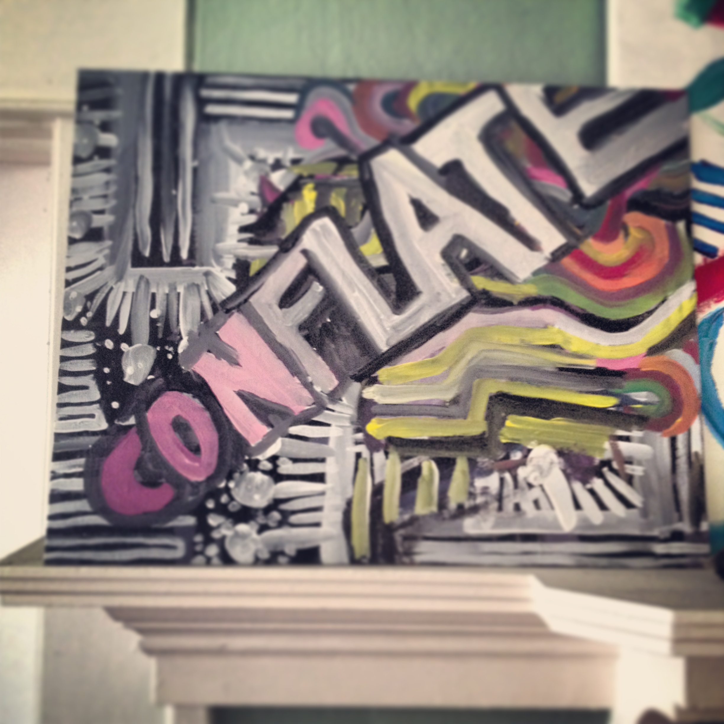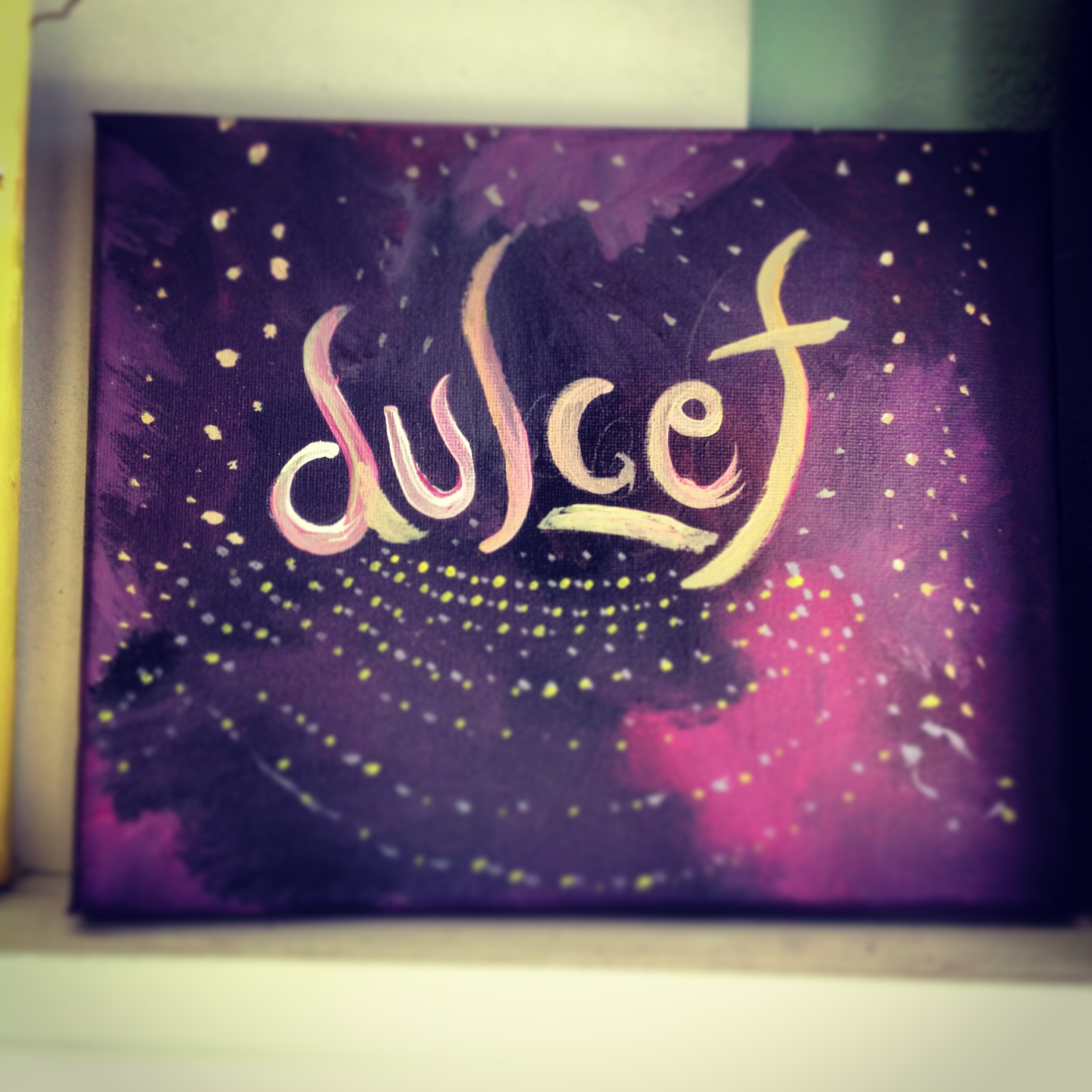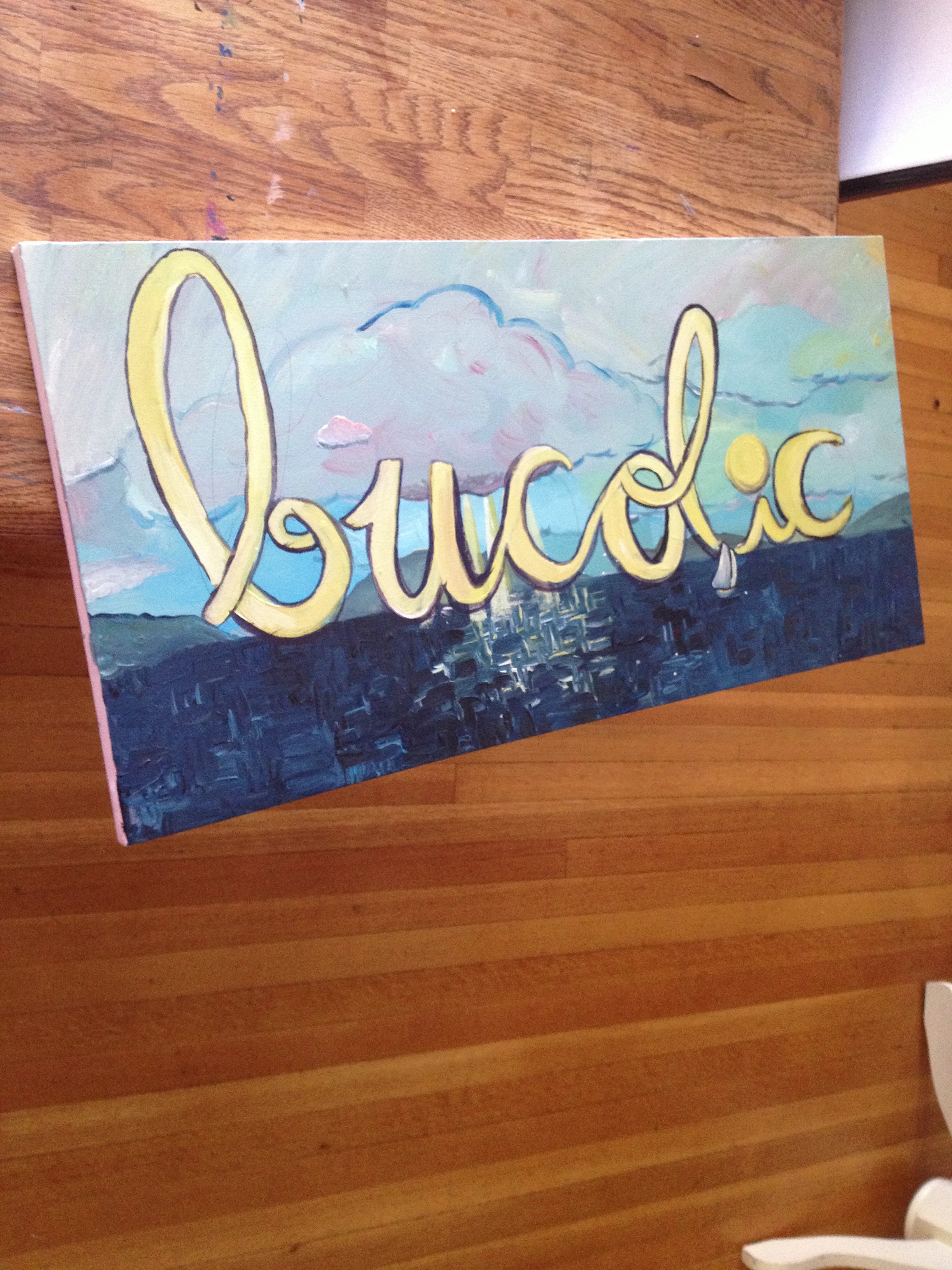 This painting became this painting which became the one above. It’s amazing to have taken something I painted over five years ago and make it something new. Today I spent some time painting words. I have a list of beautiful words that I think the world could use in the form of paintings. I used older canvases with other stuff already on them and I think it adds to the richness of association, memory and language. Subtle themes in these pieces.