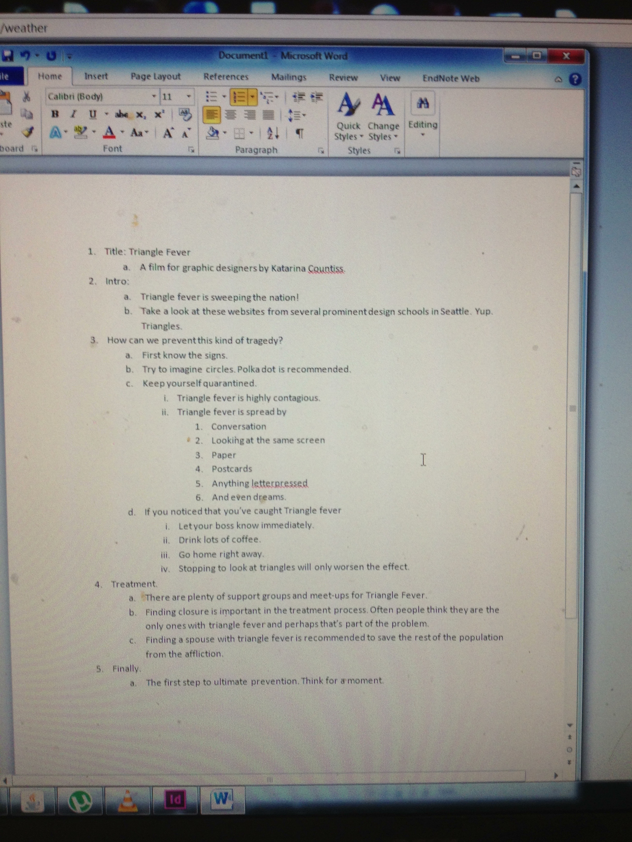 https://vimeo.com/68863973 Here’s my progress at the end of day one of the project “Triangle Fever.” It’s a PSA parody of what to do when you have too many triangles on the brain and it’s affecting your design. I have an illustrator file of text of the outline above, ready for day 2 of the project when I put in the text and add a voiceover.