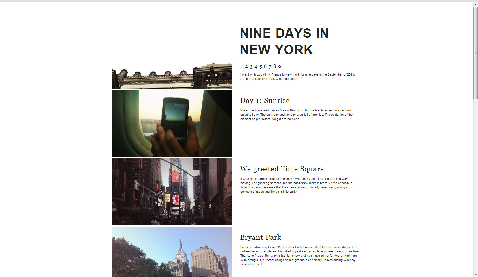 I recently went to New York and I had a great time there. It was a time of thinking. The end of summer approaching. My first summer as a certified graphic designer (I just graduated in June) and I felt a little bit like I was going to a Mecca of design. I walked a lot and I wanted to capture this time in my life. How I feel like my horizon is stretched out in front of me. I thought about how I wanted to save this experience in a website. How it acts like a bubble to keep my memories fresh.