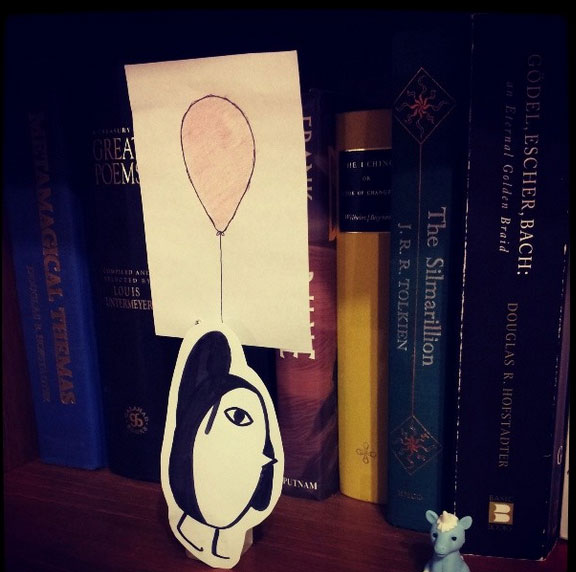 Toy Shelby product clip version 1: hand-drawn penguin, my favorite cartoon character (Shelby), using a Prismacolor Premier Brush Tip and some glue to affix it to the Modern Cube card clip. A Certificate of Authenticity: an Illustrator file with a complex-ish line then copied and rotated 15 degrees until a circle design is completed With some red diagonals for accent. Printed and then stamped with my self-inking logo stamp (I love that). An InDesign instructional document with easy-to-follow diagrams made in Illustrator including a logo that was colored in Photoshop. Jokey small print. I made this for a friend’s birthday and I think she loved it. Hard to tell with Stoics. Fun project. I like trinket design.