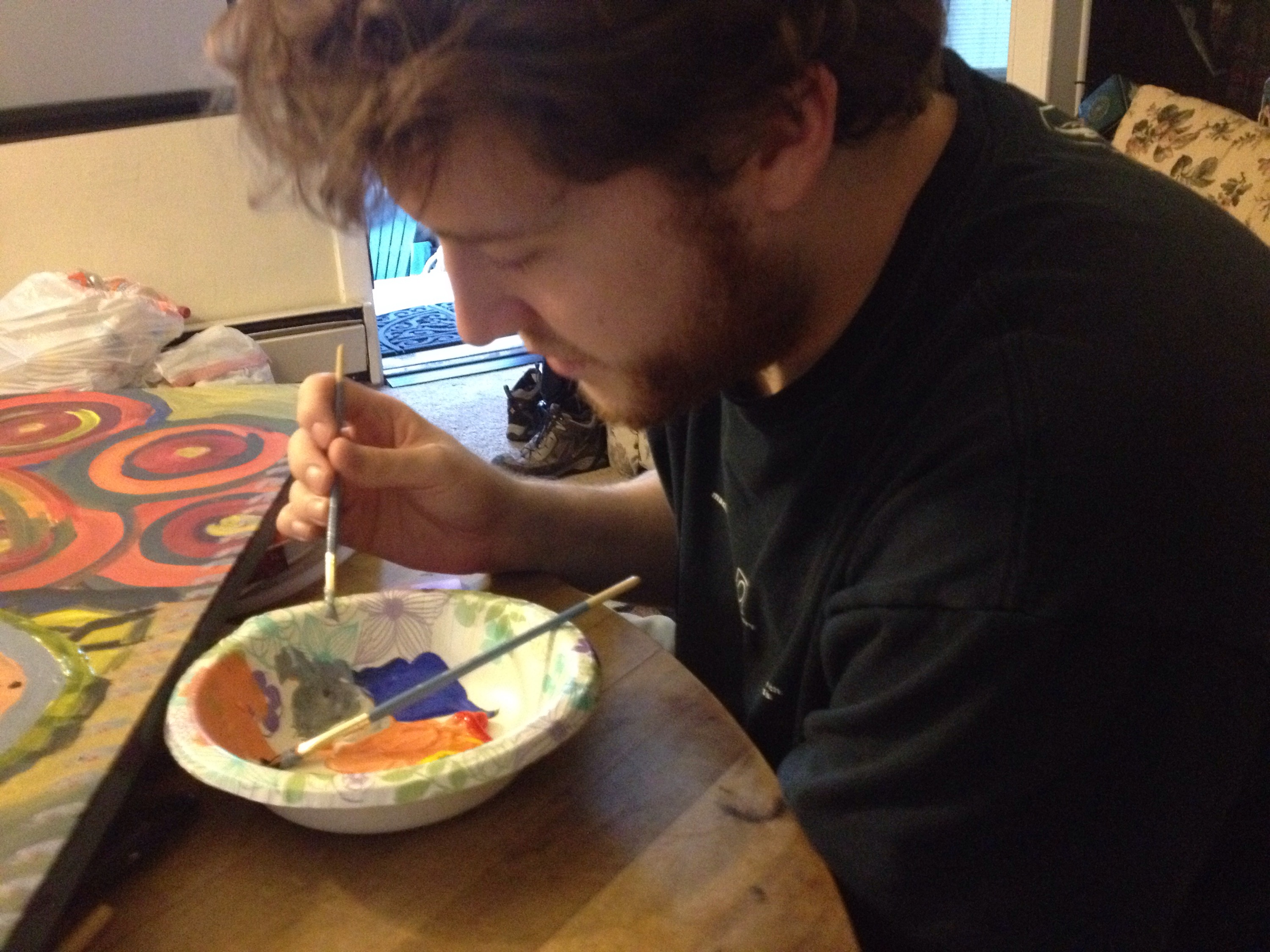 A couple of days ago, I painted this. It was an afternoon where I had a friend over and thought it would be a fun time to break out the acrylics. I call this painting “Leaf falling under bridge in a small town.” I was talking to Ryan, as we were trying to name it, giving examples of pretentious titles for works and I liked it and thought it fit. I was originally going to call it “Birth” because the central figure kind of looks like a fetus.