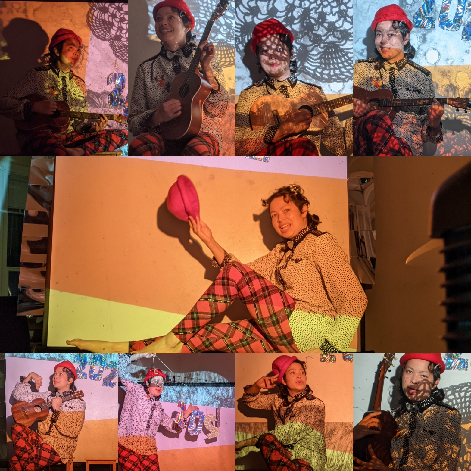 I would love to do this particular arrangement again. I like the idea of making a collage where there’s a long strip of portraits where each person gets a nice equal sized stripe to pose with their instrument or beloved object. That might be the thing I like the most about the photo is that everyone is equipped with a meaningful prop. Often photobooths give you a cheap generic prop. That’s the nice thing about partying at your own house I guess.