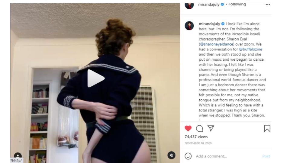 One day I was scrolling instagram when I saw Miranda July’s post. It struck me that there could be some kind of collaboration between choreographer and dancer over zoom. I was thinking a bit about how to make the work I’ve made in the past in my dance pieces happen with less people and more process. Part of this inspiration came from local theatre-maker, Evan Johnson who had recently talked to me about his process in making his works where he reached out to collaborators, a sound designer and a director. This idea of making with a team of three seemed really doable.