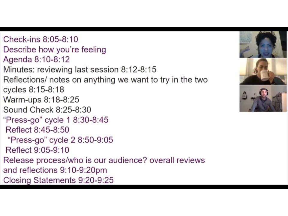 It pretty much went like that. We ended up having three workshops, and the fifth meeting was essentially another workshop, but the zoom meeting was recorded. And we decided against having “deliverables.” We both agreed that the improvisational and feedback process in our experimentation worked best as a live collaboration and felt more stifled with preloaded ideas for how the “cycles” were going to go.