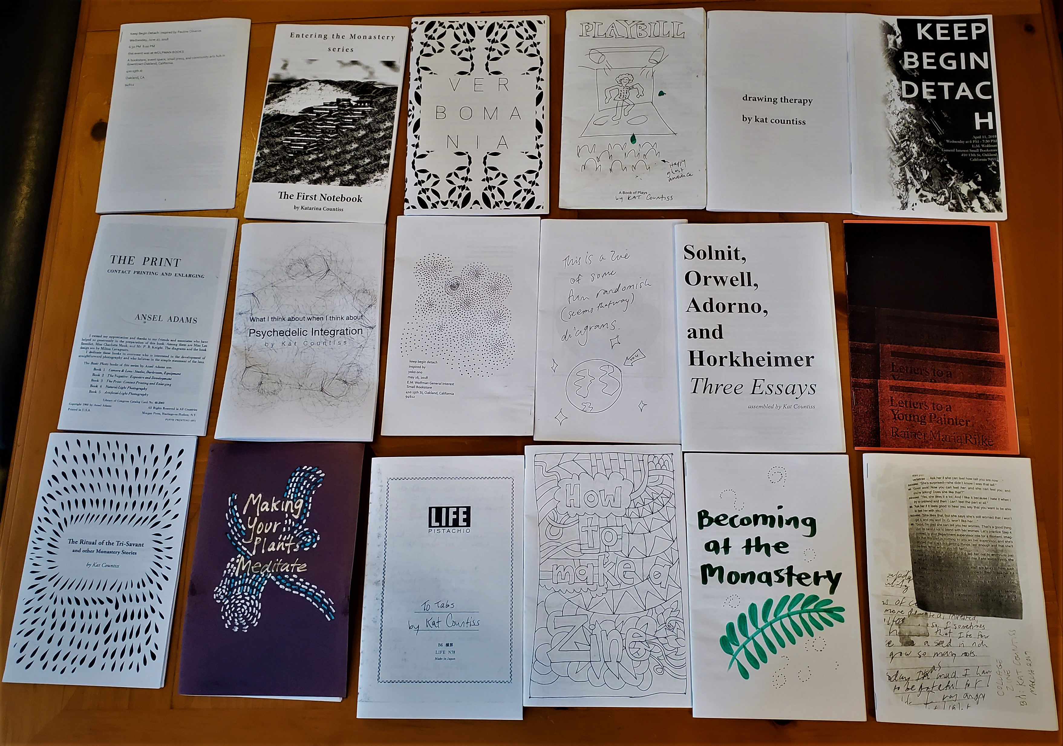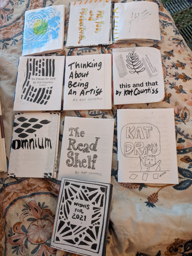 In February, 2017, I started a new art practice: zine making. Since then I’ve been making one a month and I started a patreon as an easy way to manage subscribers. Sometimes, I have the wherewithal to blog about an individual issue, but that’s been pretty rare. For the most part, I don’t archive them. It’s interesting to think about creating work with a limited edition and also a kind of ephemerality. It does make me think about reorganizing my room to incorporate a special shelf so I keep at least one copy of each zine I make on there.