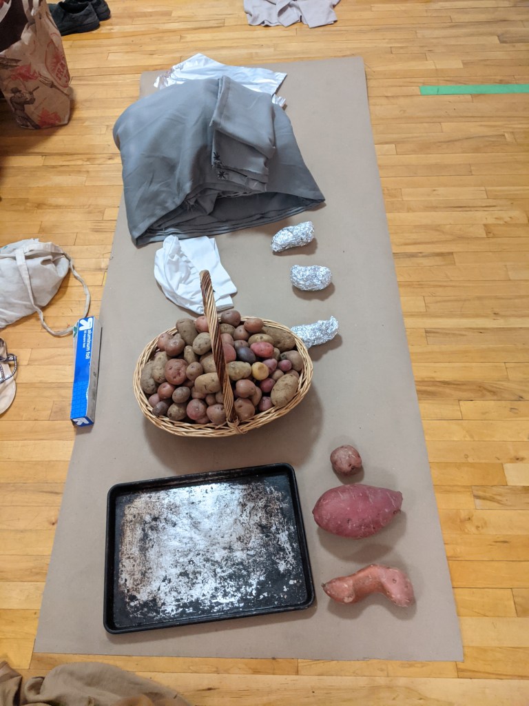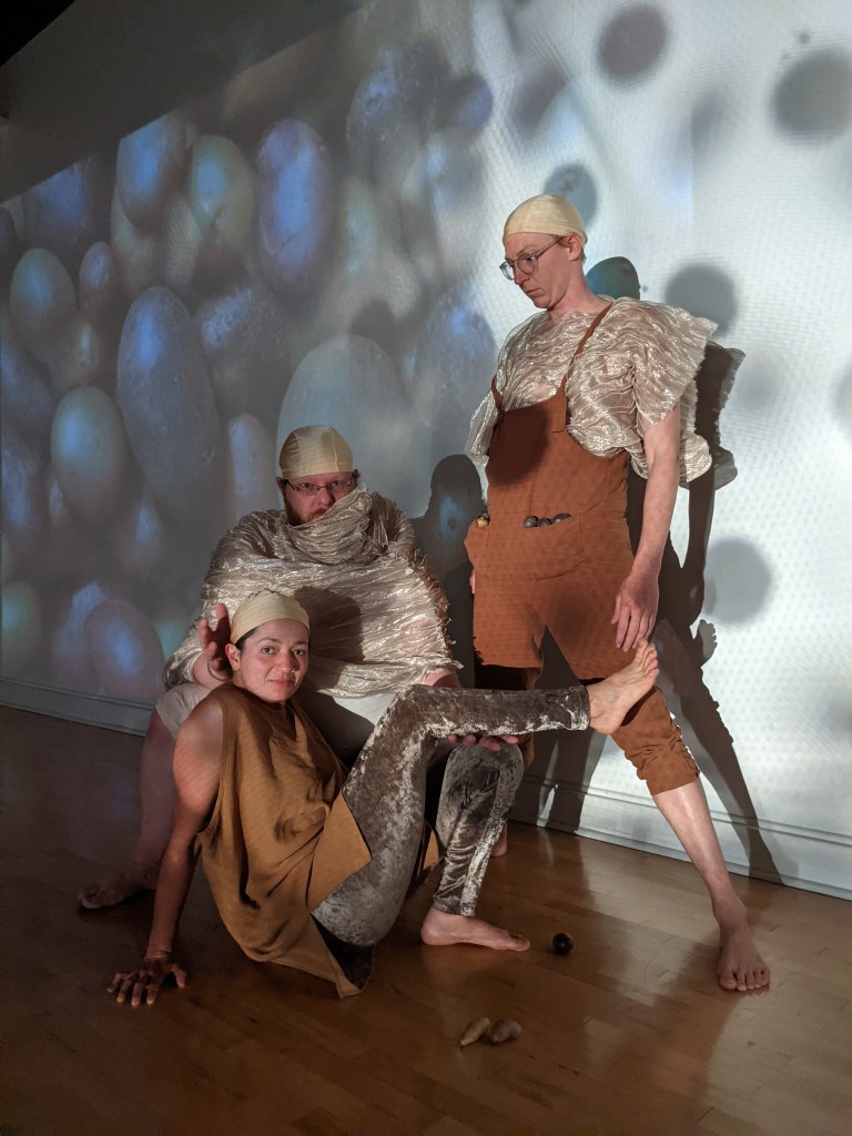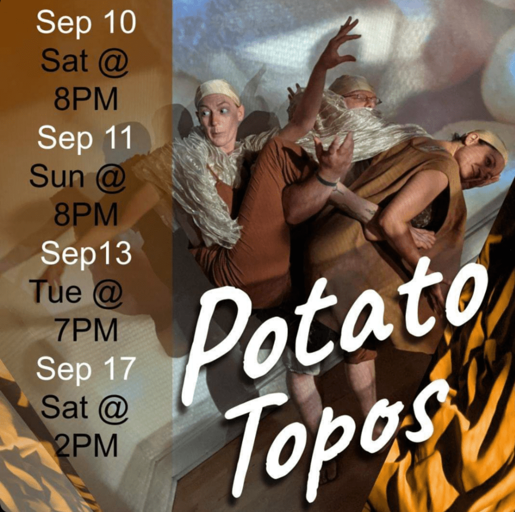 The creators of Potato Topos are also the cast. In the tradition of devised theater, these four collaborators, Fenner, Dominique, Andrew, and Kat met twice a week for two months to exchange and develop ideas. This equilateral production style produces a unique give and take of group agreement and individual directions. Potato Topos combines dance, clowning, music, and storytelling, giving the audience a mosaic of expression styles.